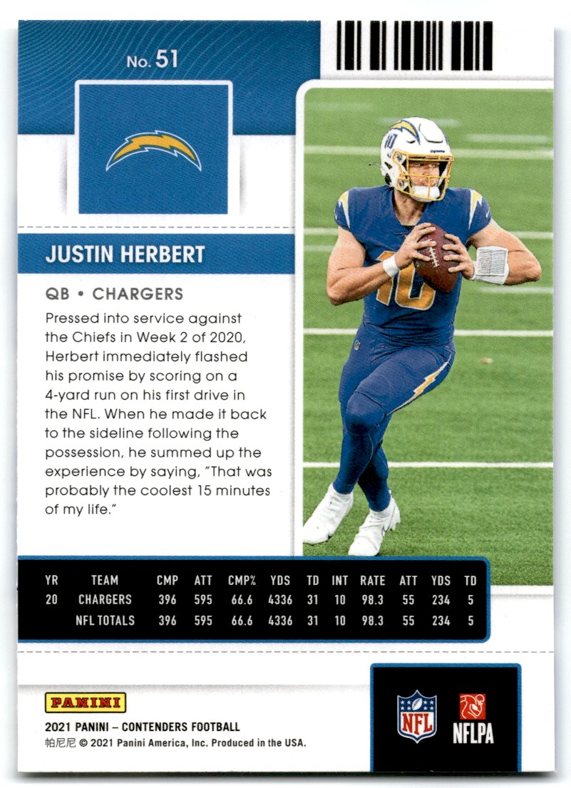 | 2021 Panini Contenders Justin Herbert Los Angeles Chargers #51 |