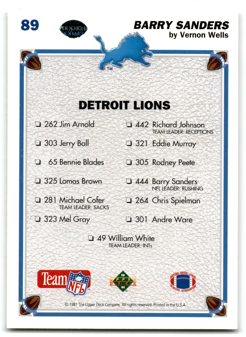 | 1991 Upper Deck Barry Sanders Detroit Lions #89 |