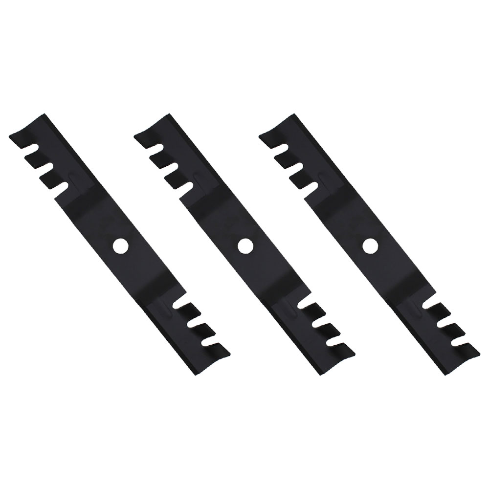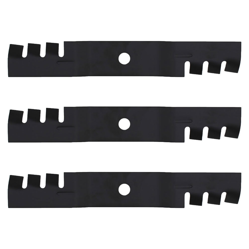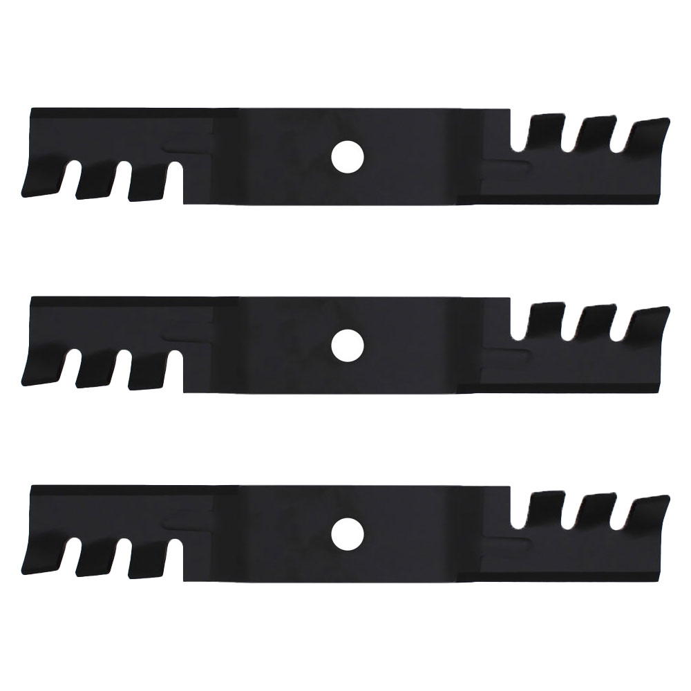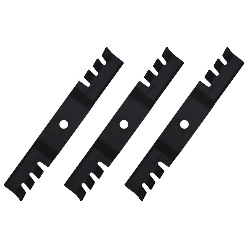 DESCRIPTION Set of Three (3) New Aftermarket Replacement Toothed Mulching Blades Fits John Deere Front Mount Mower Model: F620 Fits John Deere Riding Mower Model(s): Fits John Deere Walk-Behind Mower(s): GS25, GS30, GS45, GS75, HD45, HD75, 48-IN Technical Information: Replaces Part Number(s):