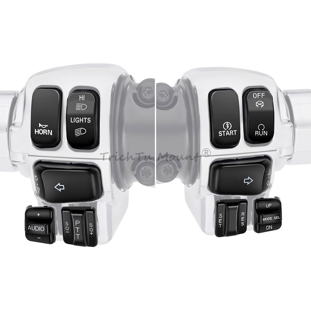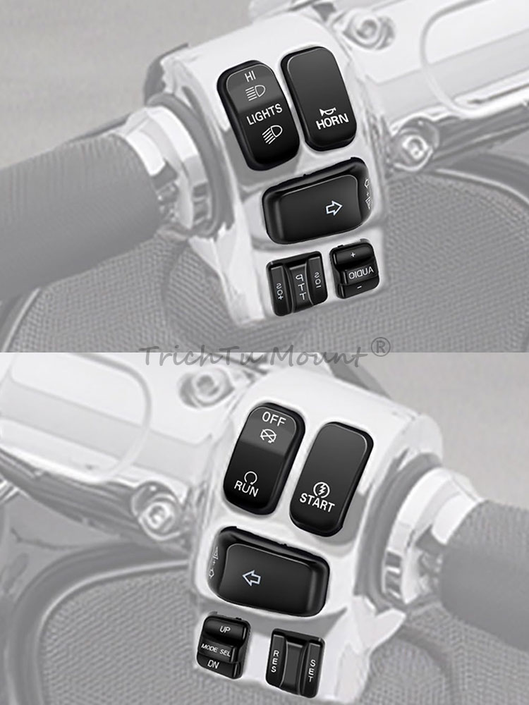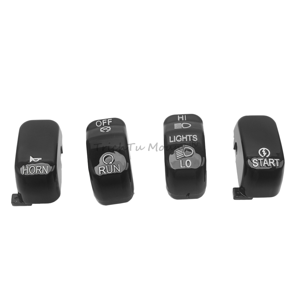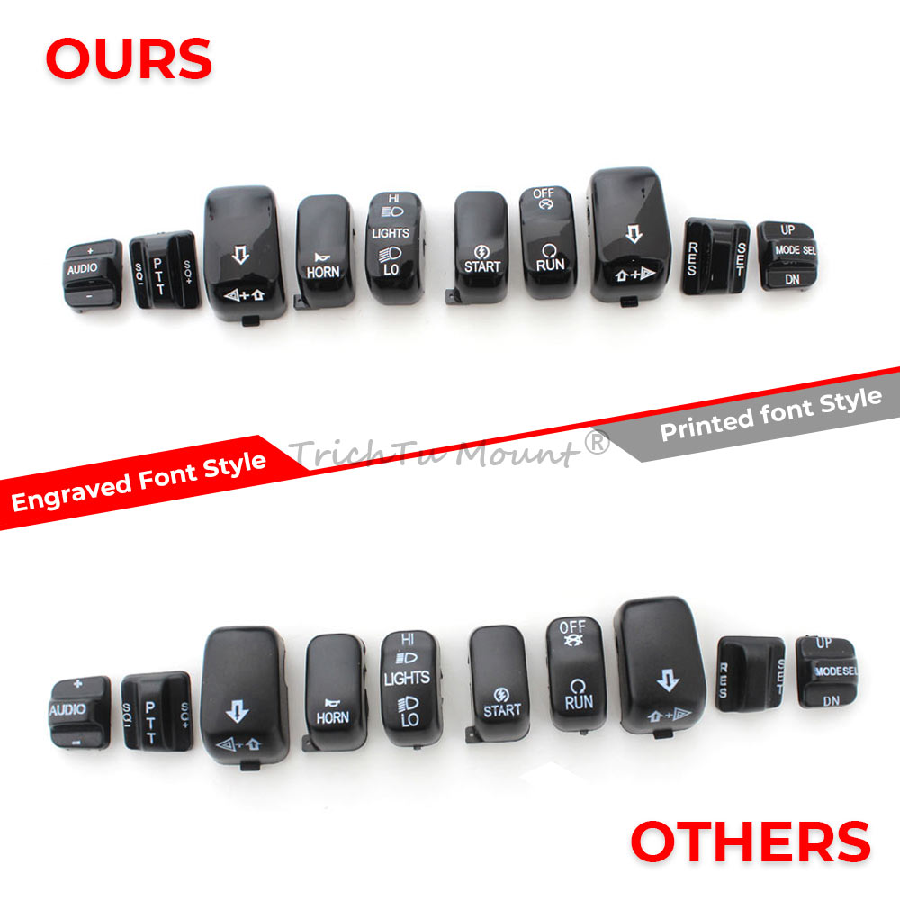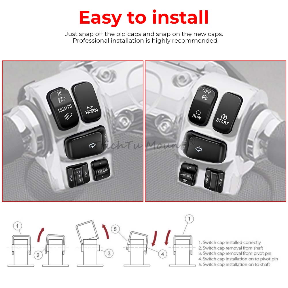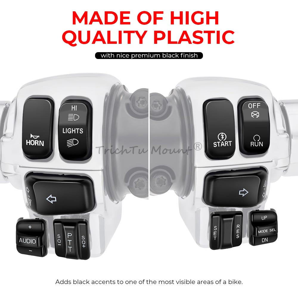 Black switch caps complement other chrome hand control accessories (Chrome/black Master Cylinder Kit, Chrome/black Hand Levers, Chrome/black Switch Housings and Chrome/black Master Cylinder Cover)