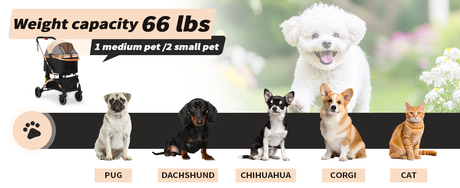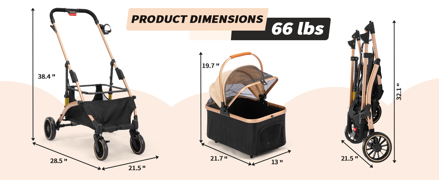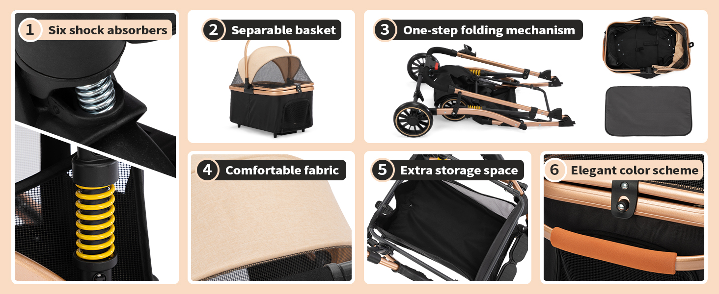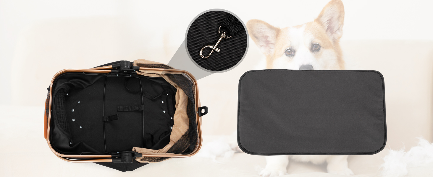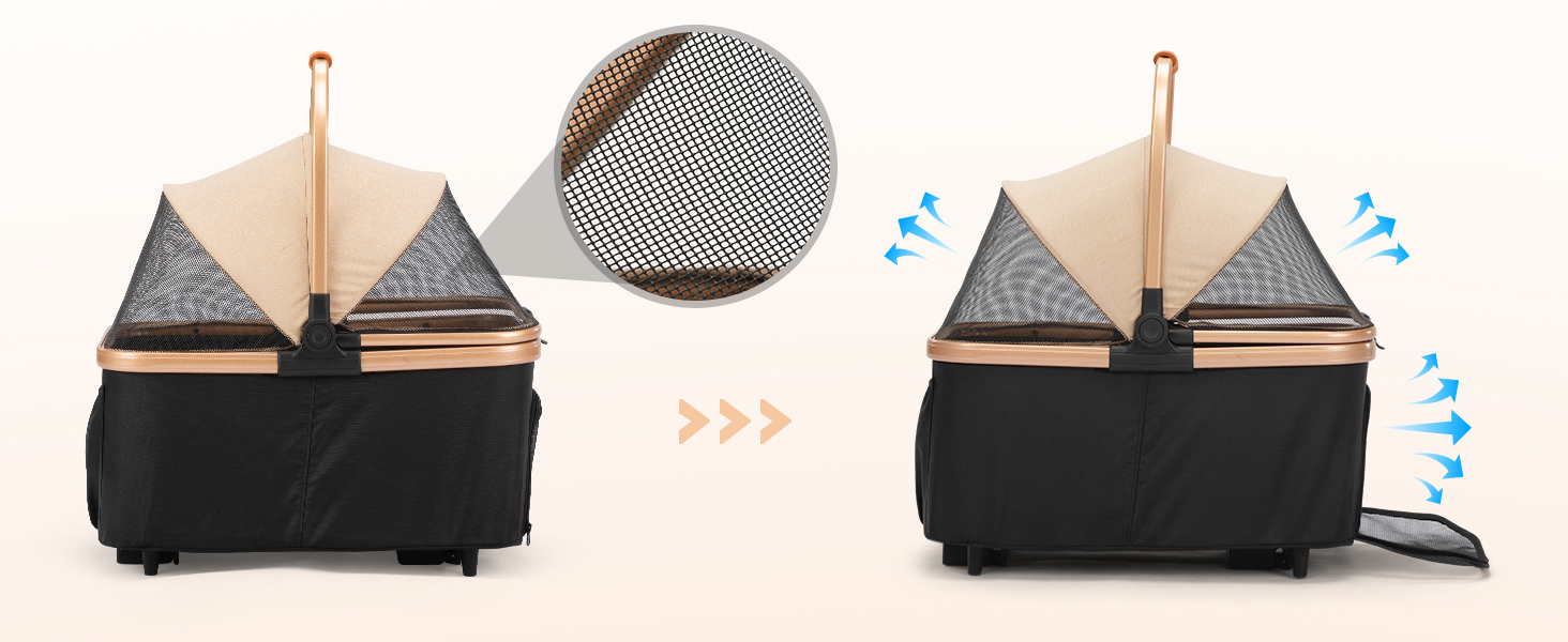 Step out in elegance with a stroller designed to turn heads! Crafted from premium rose gold fabric and durable black mesh, it combines high-end style with full functionality. Two safety straps keep your pet secure while you enjoy a smooth, fashionable stroll through the park or city streets.