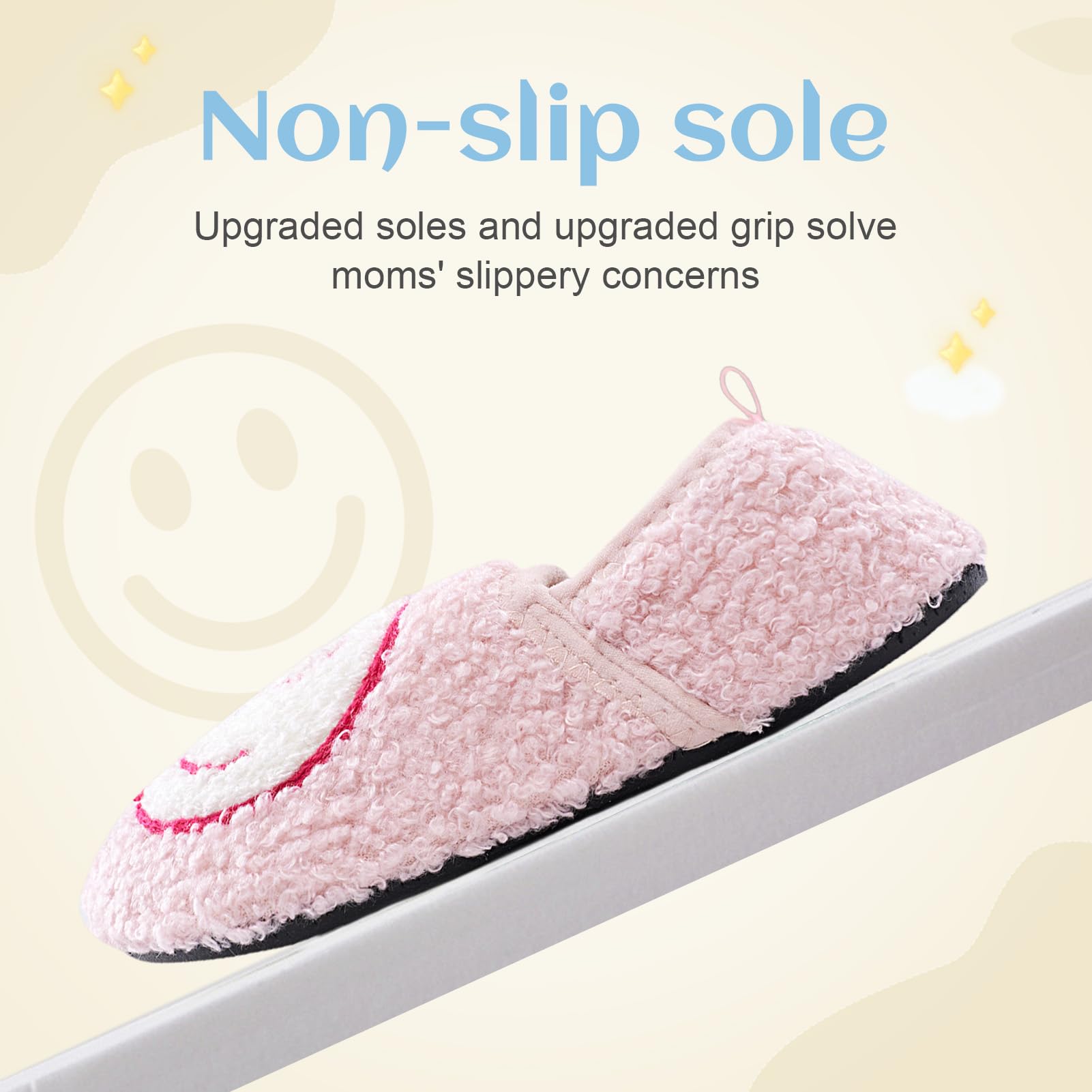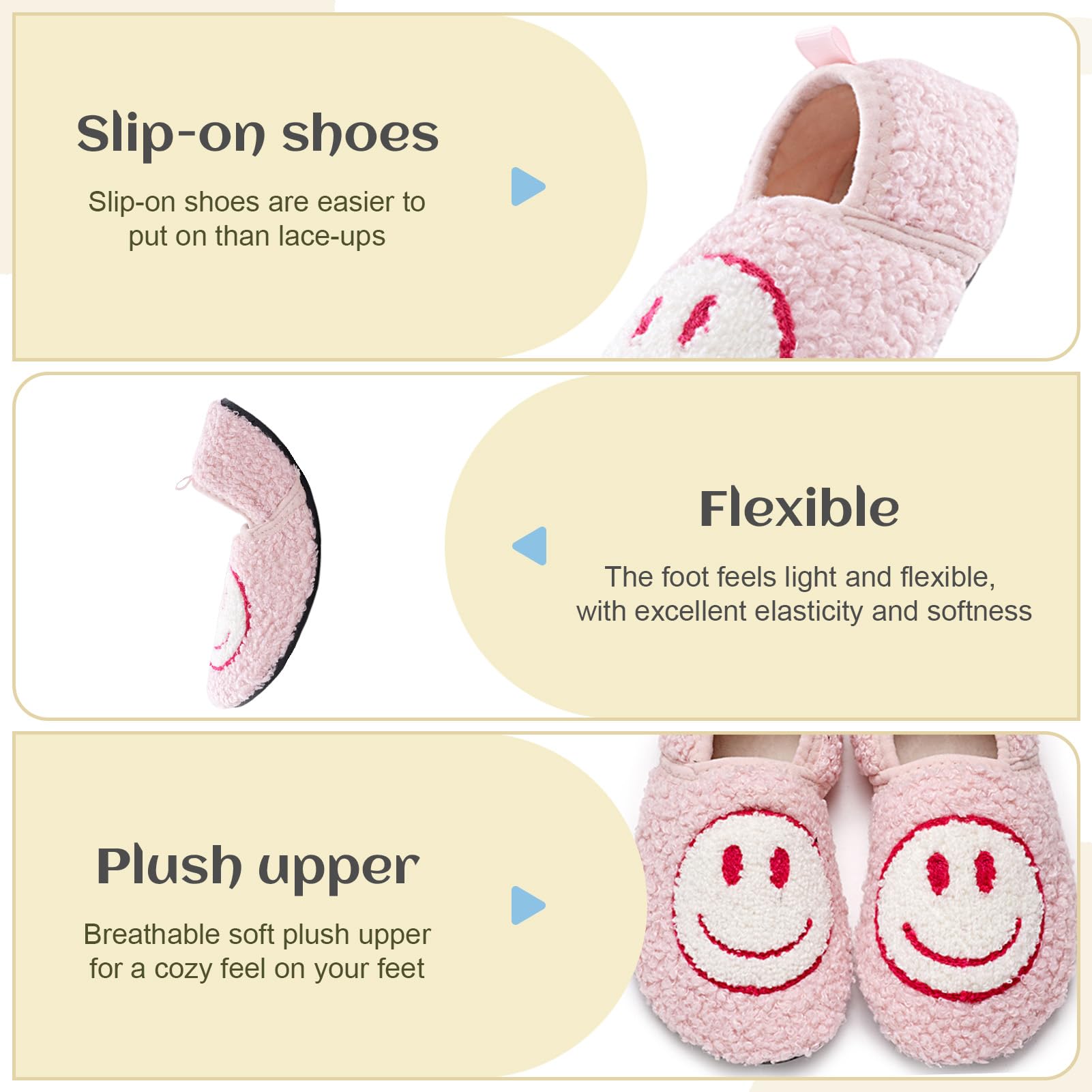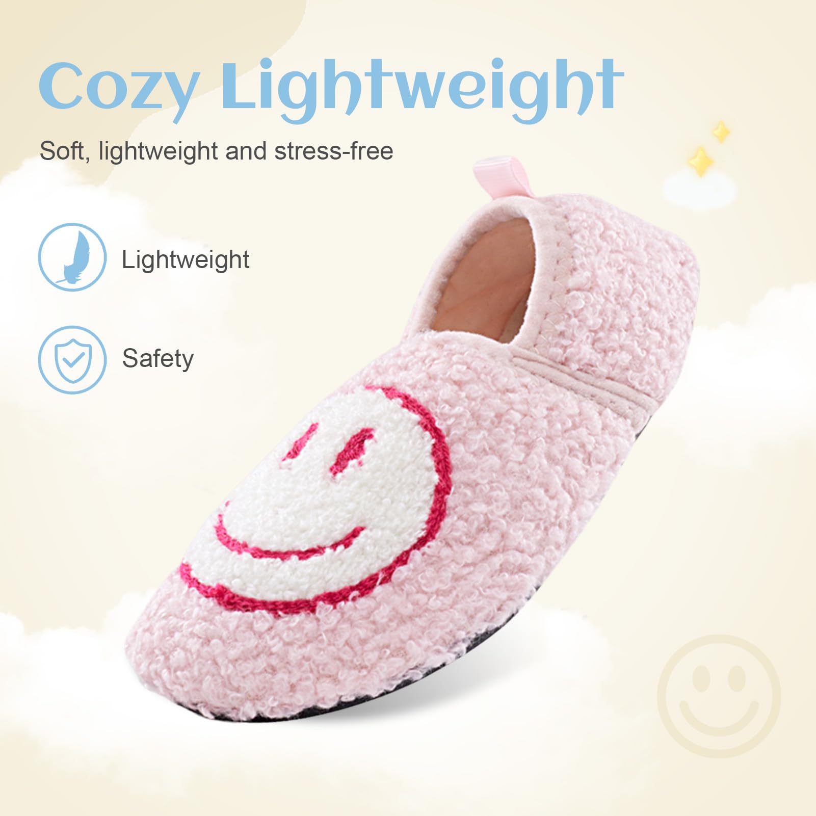 Super Soft and Lightweight Fluffy Slippers The Happy Face Slippers cloud cushion slides'high-quality insole is composed of thickened high-density memory foam and soft man-made fluffy fleece lining, along with comfort man-made fluffy plush fleece lining that encompasses your feet very well and offers soothing comfort.