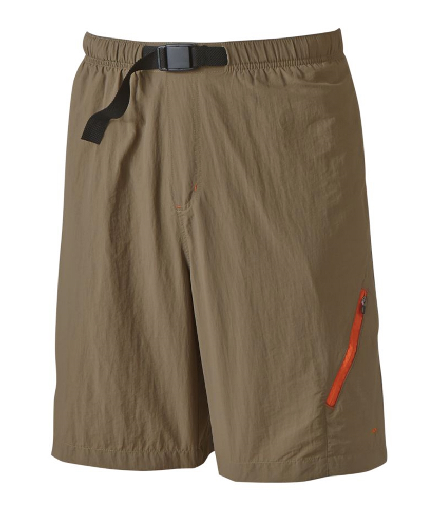 Additional Details: Solid color performance shorts Elastic waist with built in snap buckle belt Slant front and velcroed welt pockets Diagonal zippered leg pocket Sun protected and water repellant material