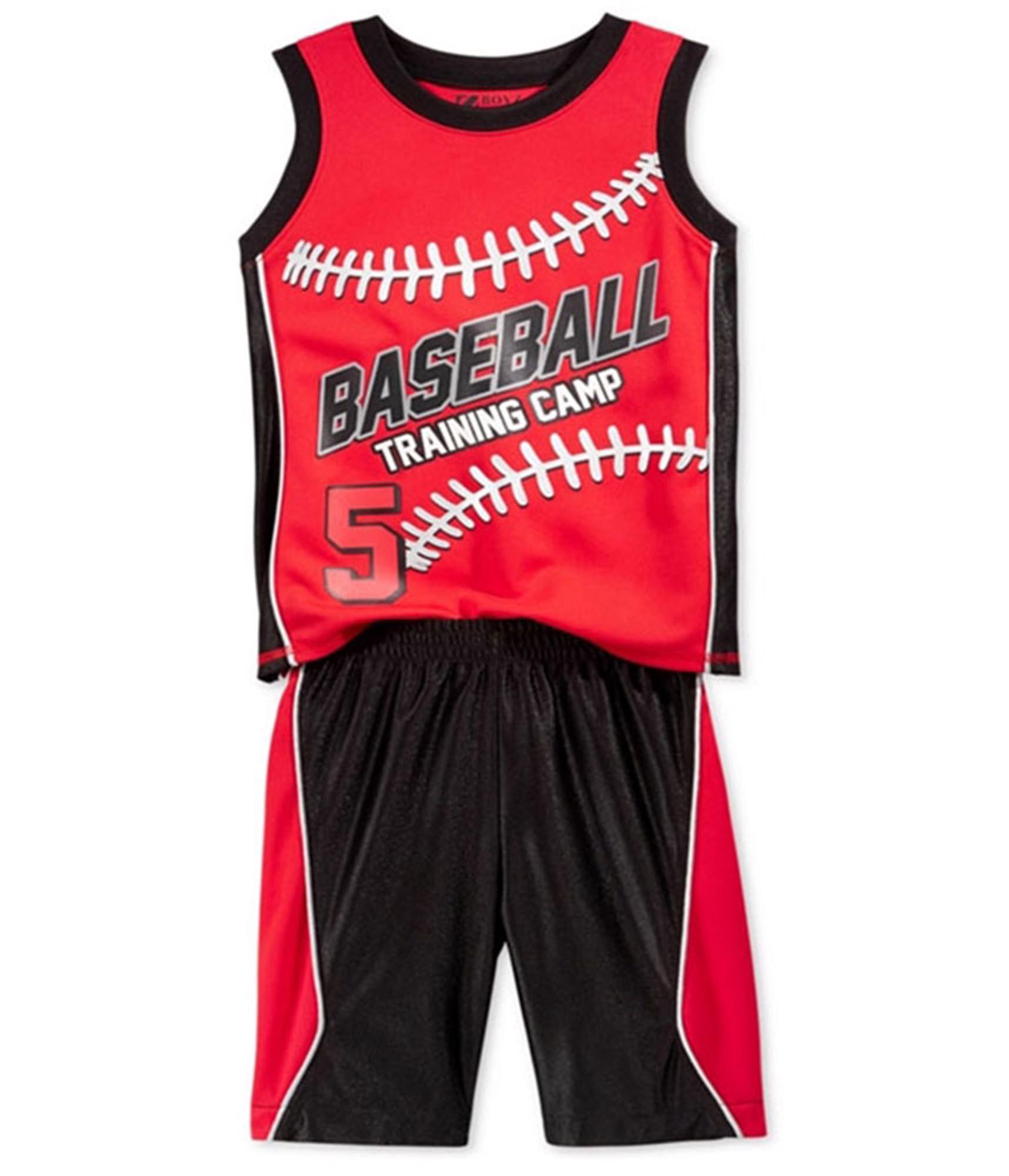 Additional Details: 2-piece tank and shorts set Graphic baseball camp design and sleeveless silhouette Two tone basketball style shorts Elastic waistband bottoms drop to knee length