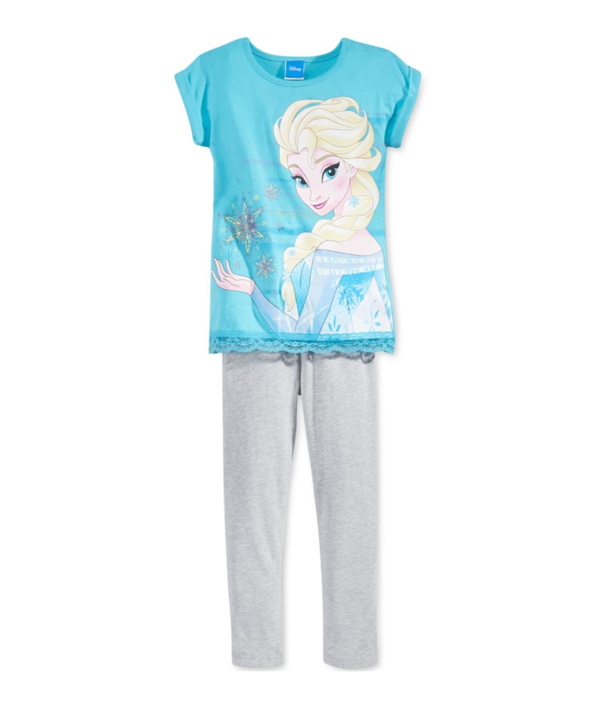 Additional Details: 2-piece tee shirt and leggings set Solid tee with Elsa graphic and glitter design Crew neck and lace ruffle at hem Solid stretch leggings with elastic waist