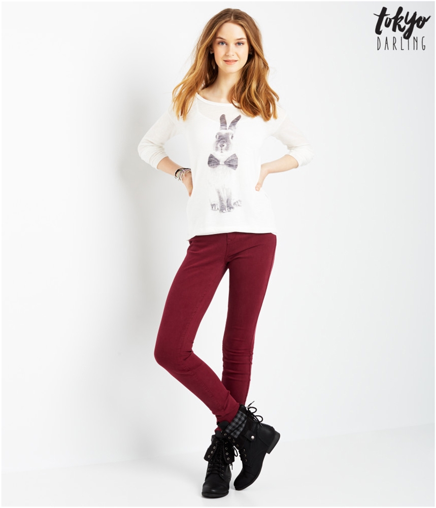 Additional Details: Cute bow tie wearing bunny graphic Sheer knit tee Wide neckline Long sleeves