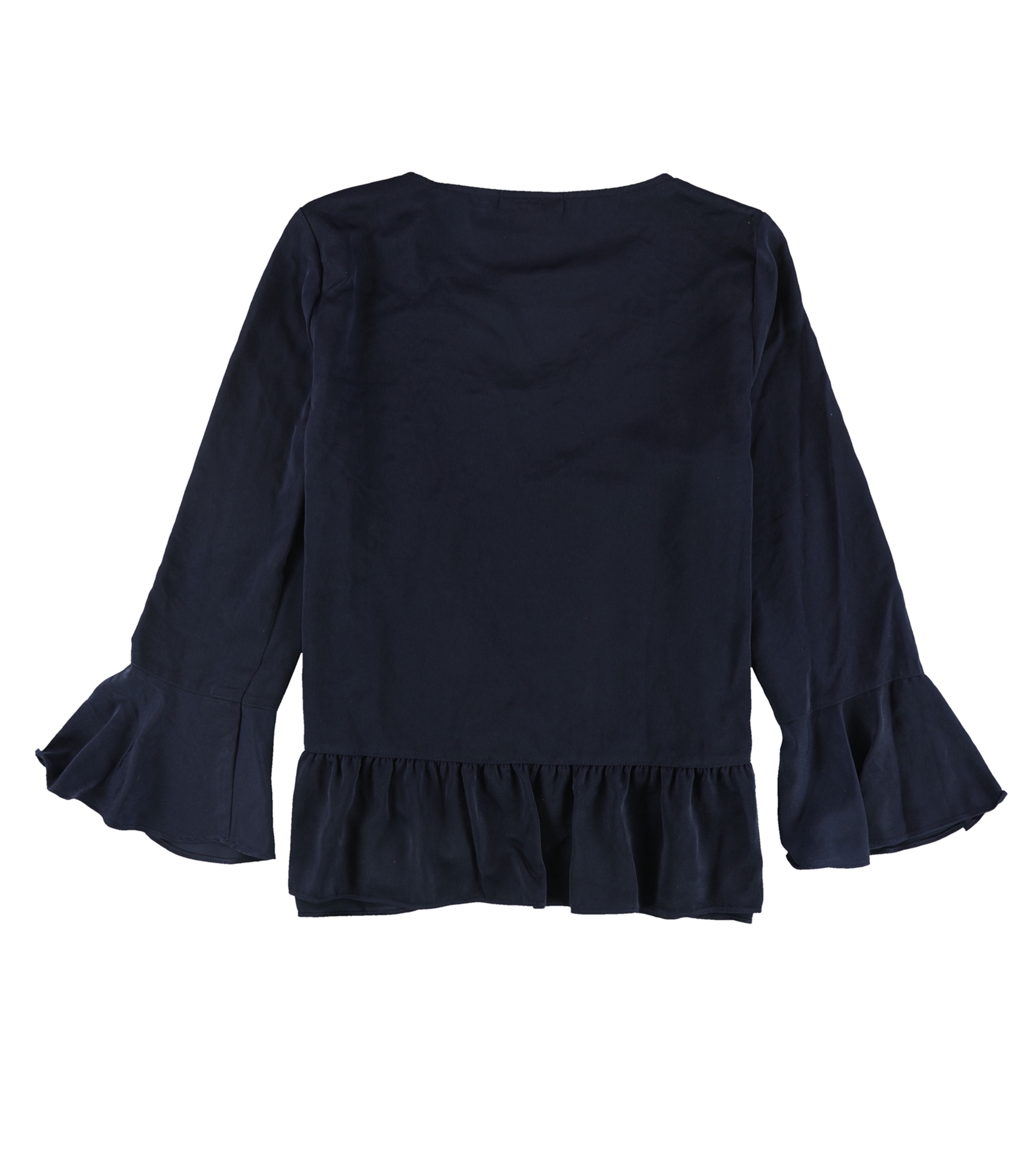 UNIQUE DESIGN: Featuring three-quarter bell sleeves, a pullover style, crew neckline, and ruffled detail down the left side, this blouse adds an elegant touch to any outfit.
