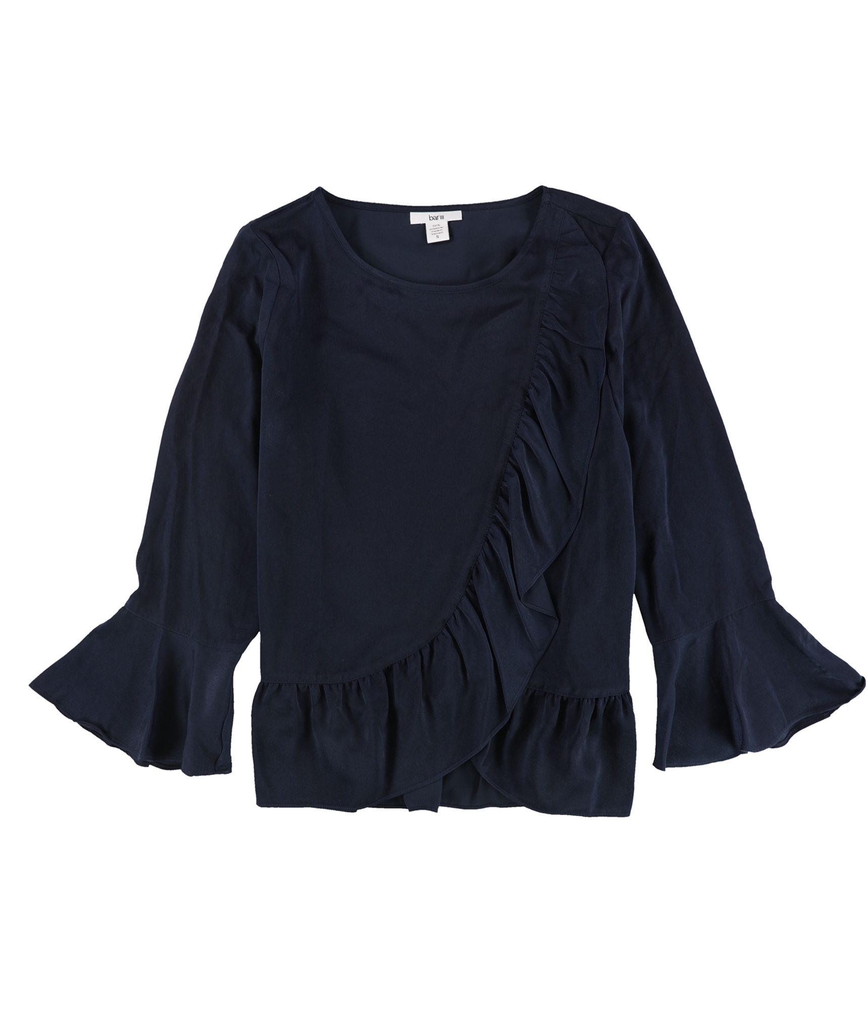 Crafted with passion from the thriving hubs of Vietnam, the bar III ruffled knit blouse is a fusion of tradition and modernity. This solid casual top beautifully incorporates a classic fit with the flair of contemporary fashion, ensuring that you stand out in every crowd. The defining three-quarter bell sleeves add a touch of whimsy, while the pullover style paired with a crew neckline ensures an elegant silhouette. Constructed entirely from high-quality polyester, the medium weight of this blouse promises both style and comfort. Whether it's a casual day out or an evening rendezvous, the ruffled detail running down the left side ensures you make a statement. With bar III, every moment is a celebration of fashion.