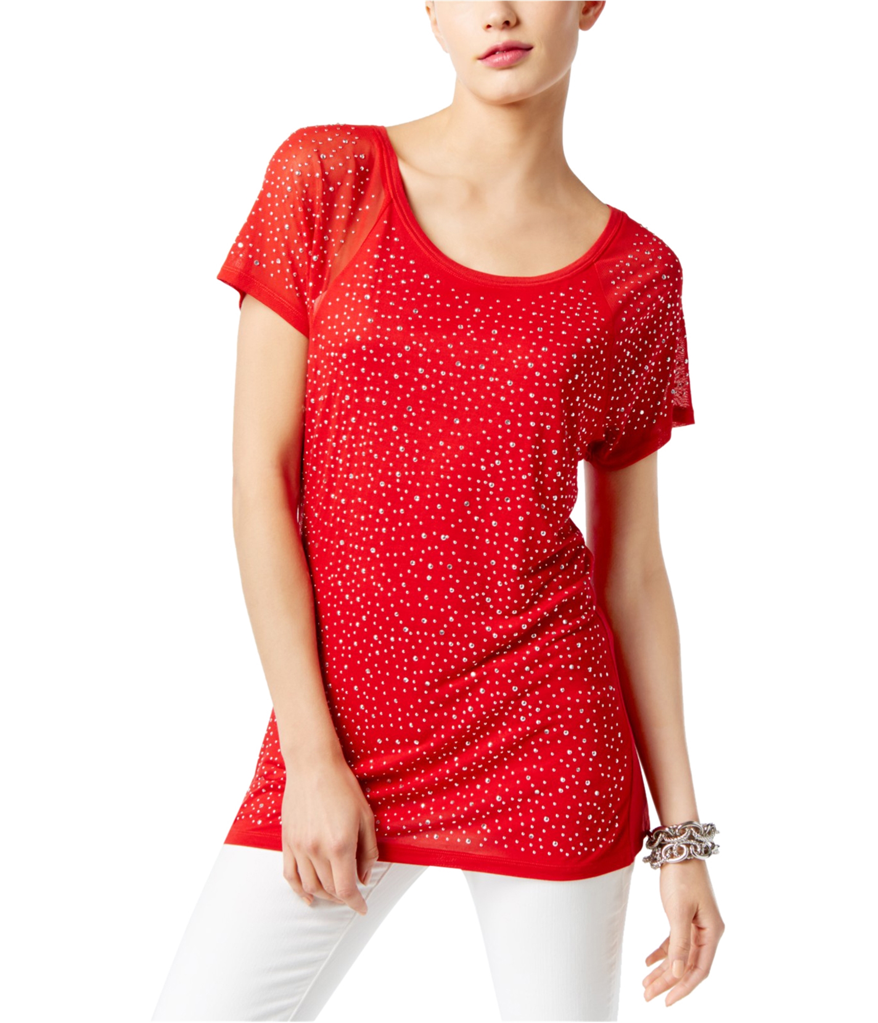 Additional Details: Casual textured tee shirt Rhinestones throughotu front Pullover style with scoop neckline Short sleeve