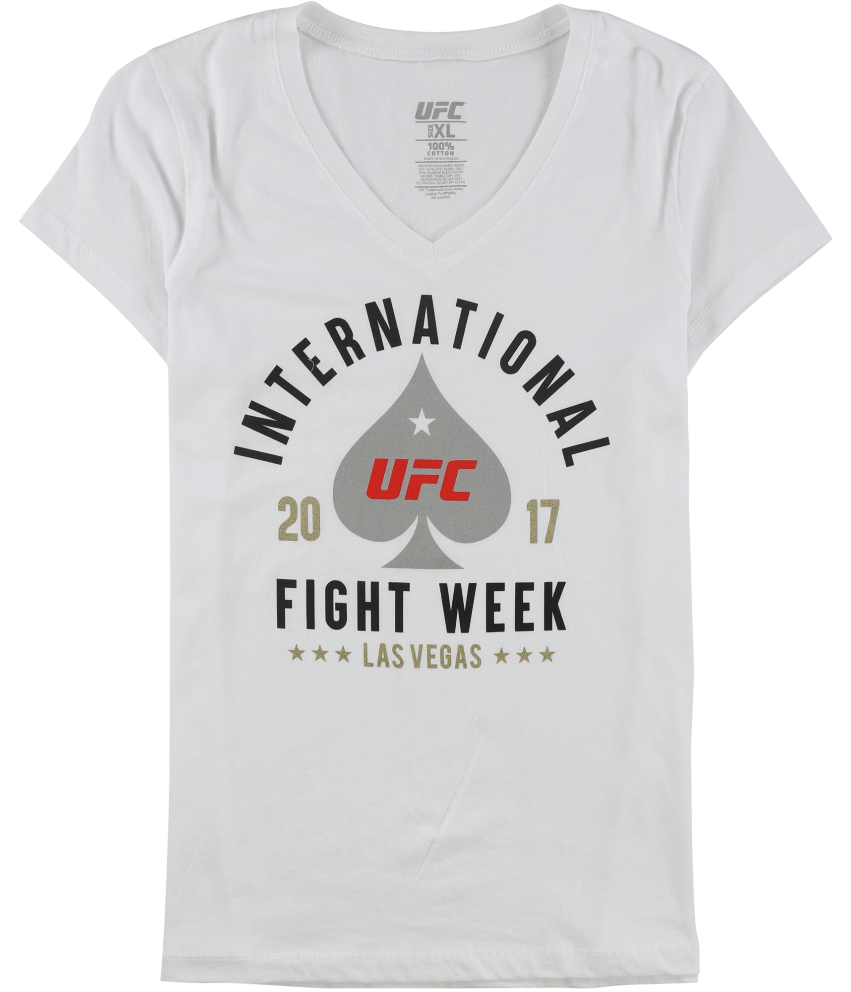Style Number: 022829 Gender: Womens Country of Manufacture: Nicaragua Collar Style: Collarless Fit: Not Specified Material: 100% Cotton Pattern: Graphic Print Season: All Seasons Density: Medium Weight Sleeve Length: Short Sleeve Occasion: Casual Theme: Sports Performance: MMA League: UFC