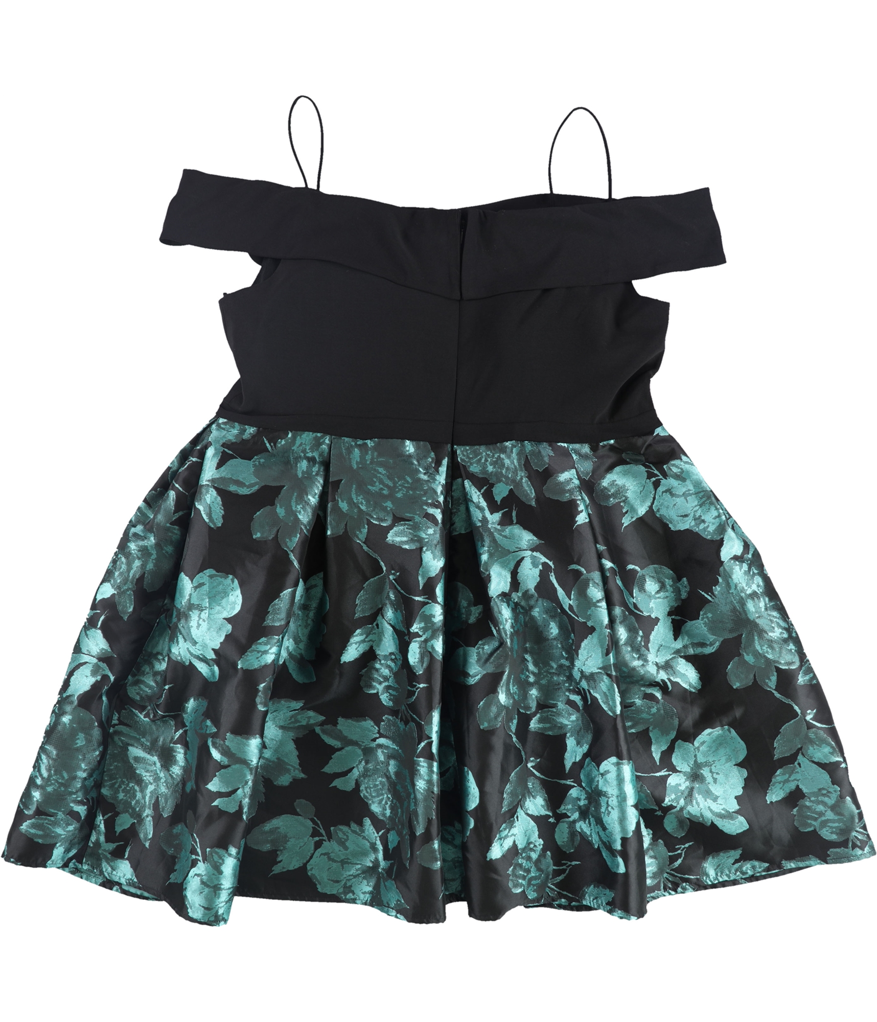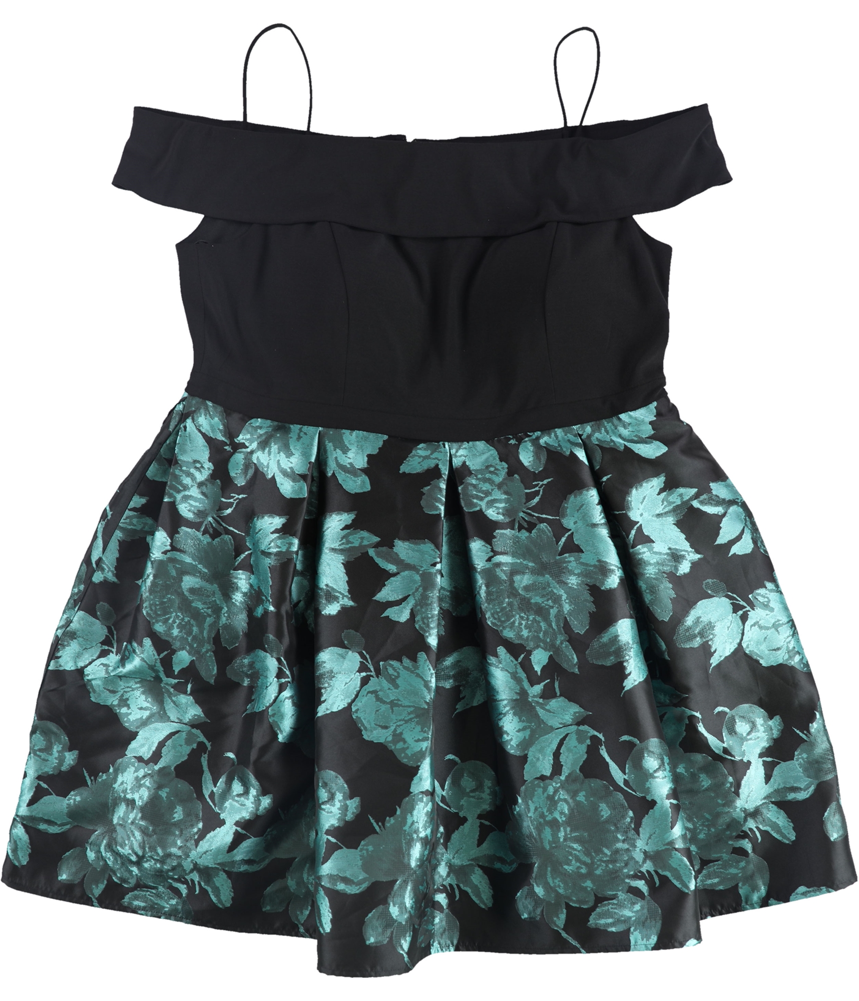 Additional Details: Off the shoulder fit with straps Zipper on back with hook and eye closure Floral print on skirt portion Pleats throughout