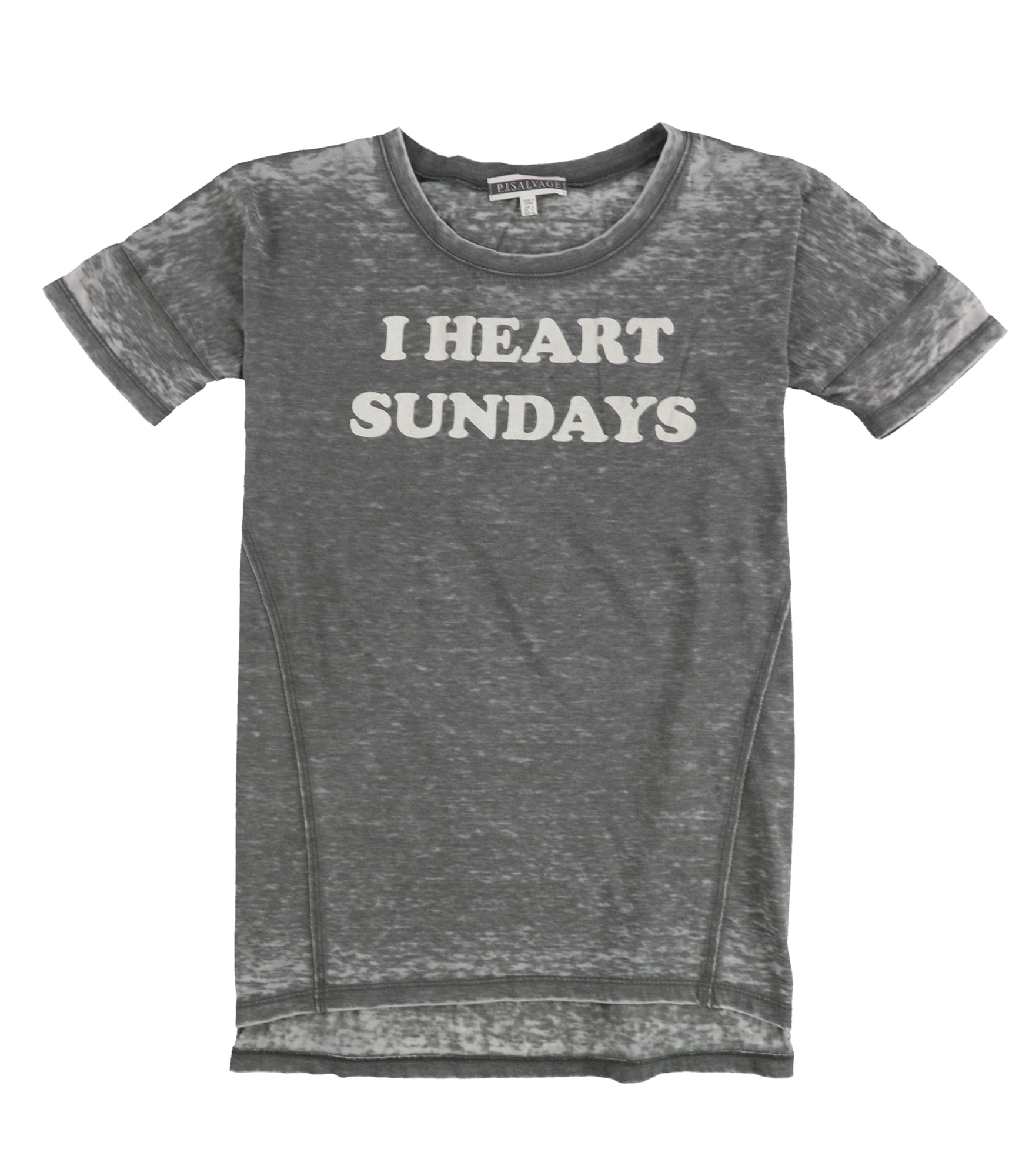 Additional Details: I Heart Sunday text on burnout style shirt Diagonal side seams with raw edges High/low hem