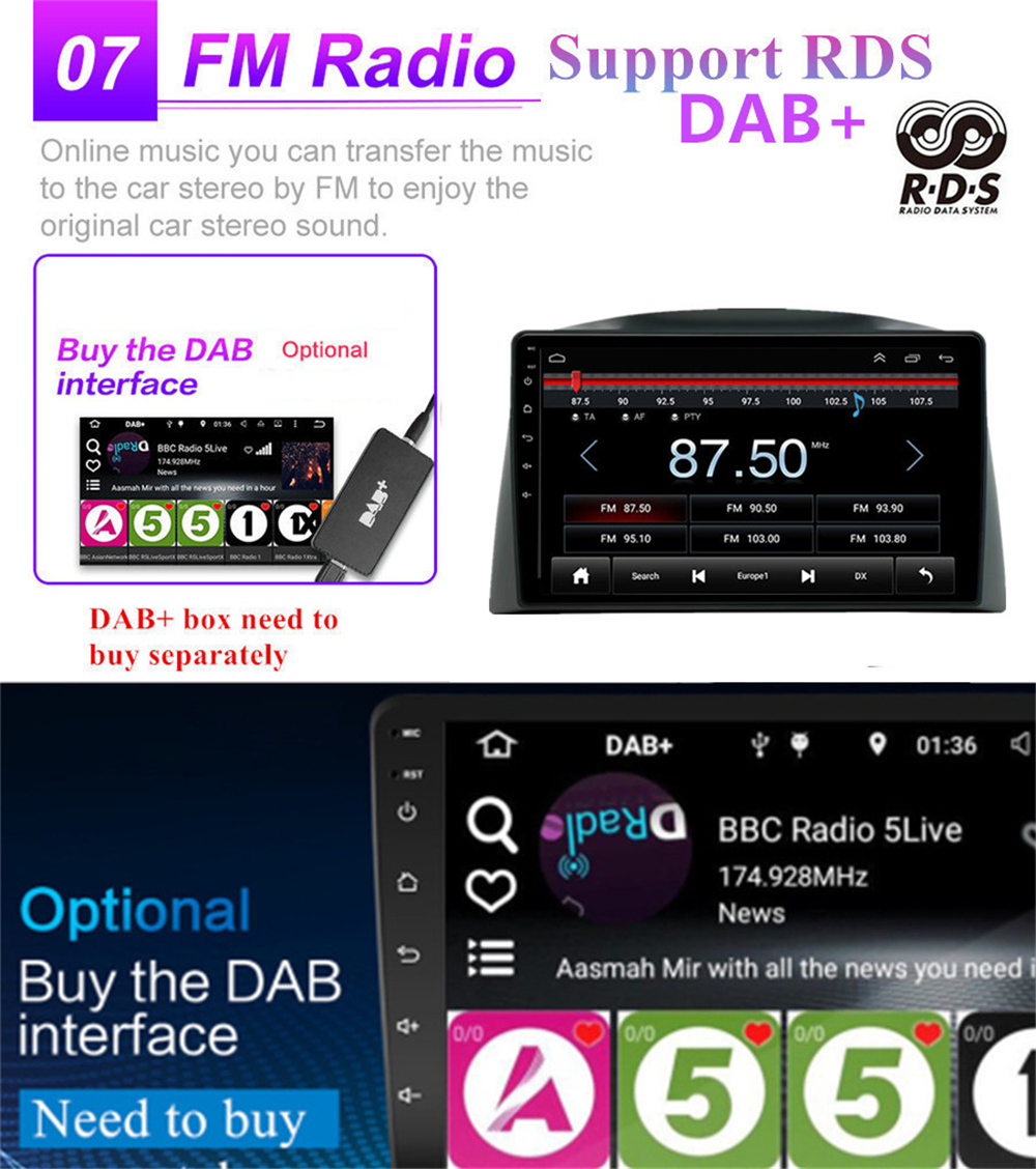 Radio | - FM Tuning Range: 87.5-108MHz - FM Increment: 0.05MHz(EU)/0.1MHz(US) - FM Area: Europe/USA1/USA2/Japan/Russia - RDS:On/Off |