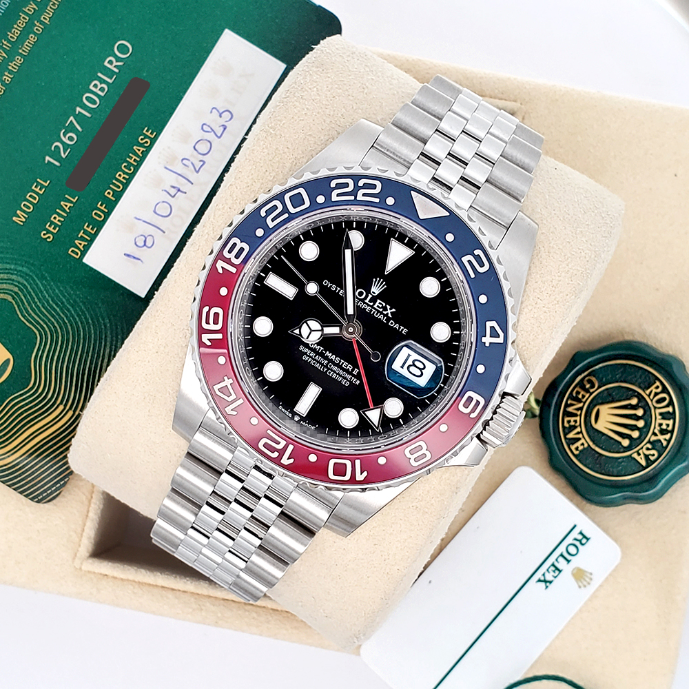Unworn 2023 Rolex GMT-Master II 40mm Pepsi Red/Blue Steel Jubilee Watch, Ref 126710BLRO.