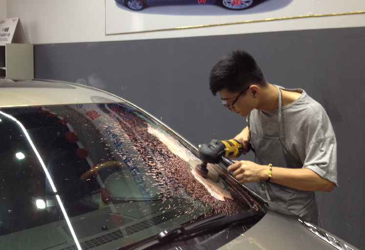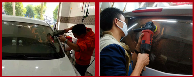 6. Place the polishing wheel on your work area, use small size felt wheel if scrach is near corner of windows,keep the wheel moving in an up and down and circular motion.
