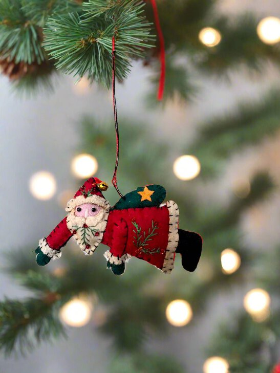 This is a wonderfully detailed heirloom quality handcrafted felt ornament. It is accented with intricate stitching and beading. Each piece is one of a kind. This is handcrafted and may have variances. 3.5" Perfect to display on one of our many Holiday trees.