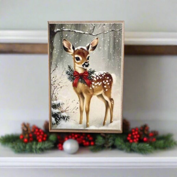 Featuring a cute baby deer surrounded by softly falling snowflakes and a festive red bow nestled in pine sprigs, this charming scene brings cozy winter vibes to any space. Printed in a gentle painterly style on a sturdy wood block, it stands perfectly on shelves, tiered trays, mantels, or desks. Whether for your farmhouse or as a whimsical gift, this little reindeer is sure to brighten the season with playful charm.