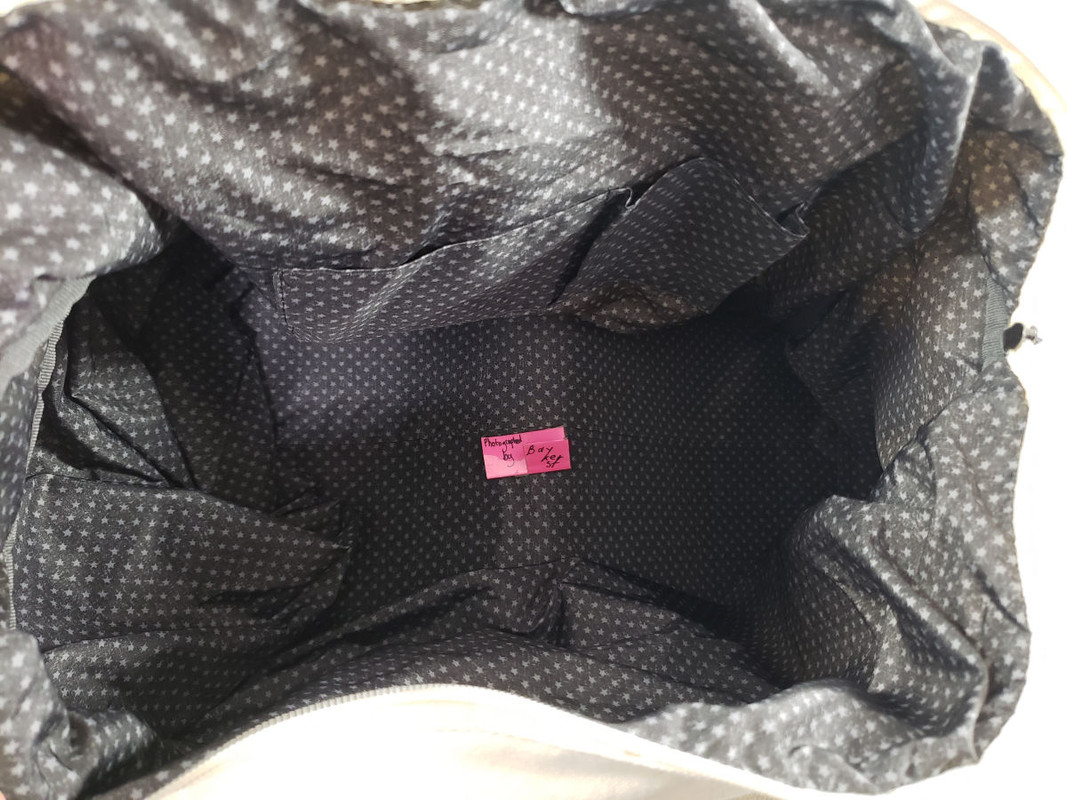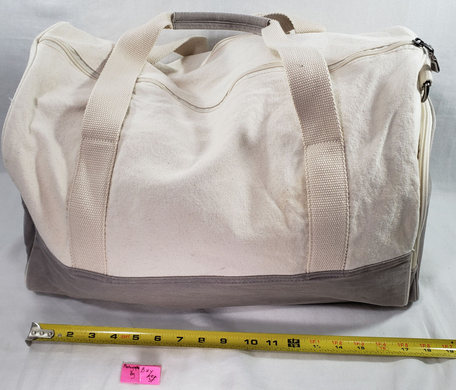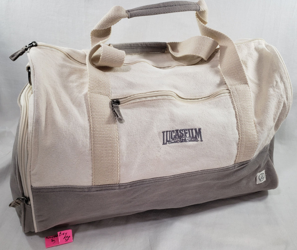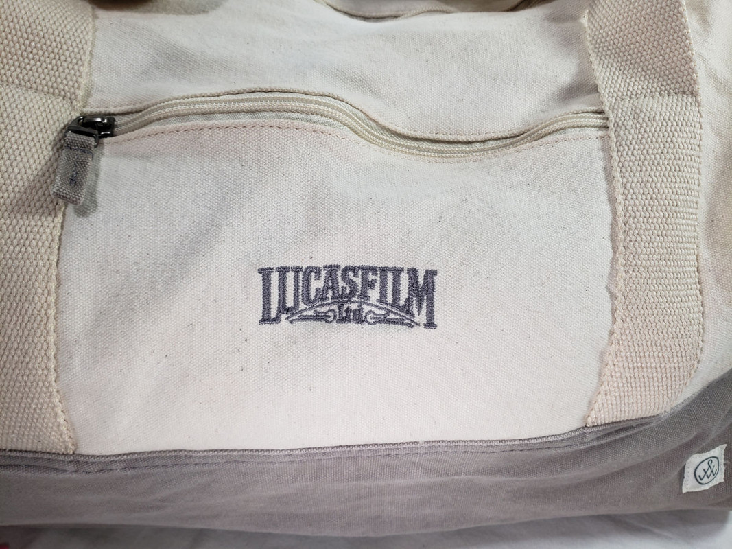 Lucasfilm Crew Duffel Bag The bag will be shipped collapsed flat and folded over flat. This will cause the pliable cardboard bottom of the bag to fold. In order to retain the original flat bottom, expand the bag and use it normally. The material of the bag is not stated on its tag, but the material feels like a natural fiber such as cotton or canvas. Check out the pictures below for more detail. |