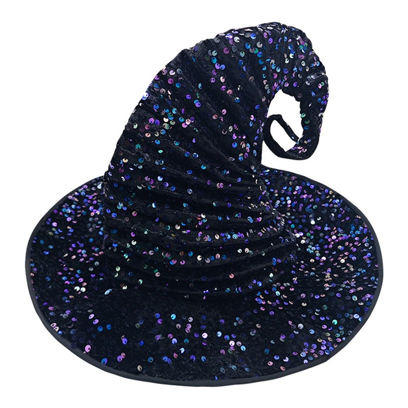 The wizard hat is adorned with shiny sequins, adding a touch of glamour and sparkle, making it a trendy and eye-catching accessory in line with the latest fashion trends.