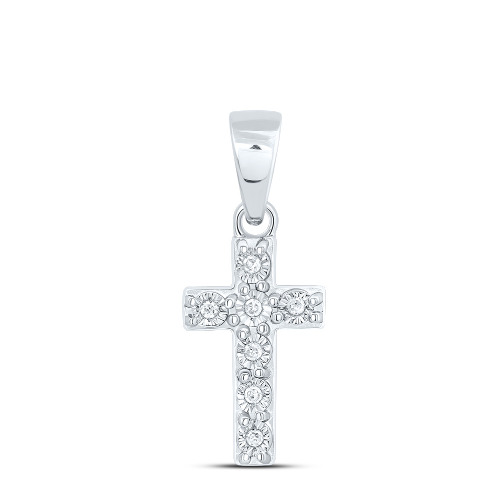 This eye-catching Diamond 1 Row Cross Pendant is crafted in 925 Sterling Silver and shimmering White Diamond, ensuring sparkle from every angle. Radiant with 0.13 ct. t.w. of Diamond, this pendant is polished to a lustrous shine. Exclusive style has a well built frame to withstand everyday wear and tear. The Diamond are secured in Prong setting close together, making the overall appearance larger and lustrous. A matching bail to compliment this pendant. These are all 100% genuine Round cut Diamond with matching clarity and color throughout. This Pendant measures 17mm (Including the Bail) long and weighs approx. 1.42 gr. This style would make a perfect addition to your jewelry collection.
