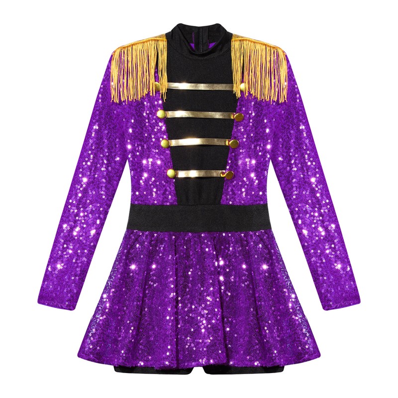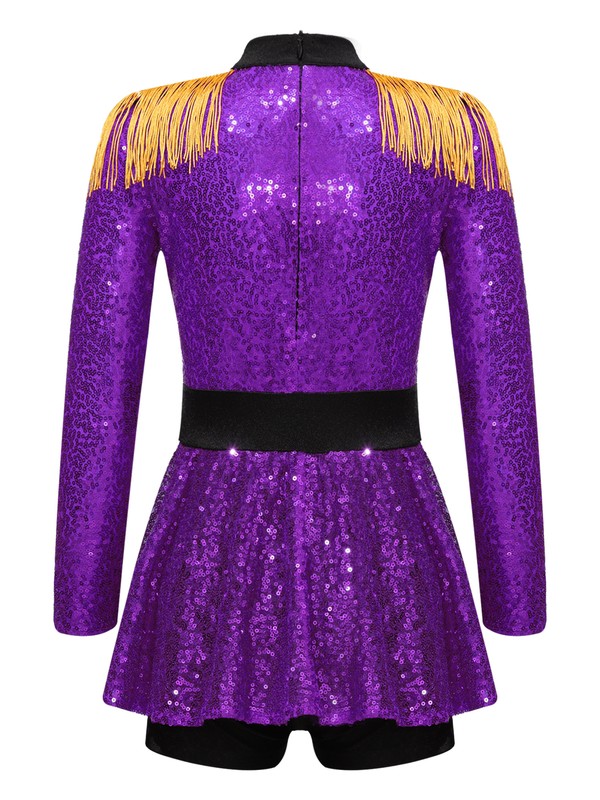 Shiny sequins circus costume for girls, long sleeve short dress with tassel epaulet.