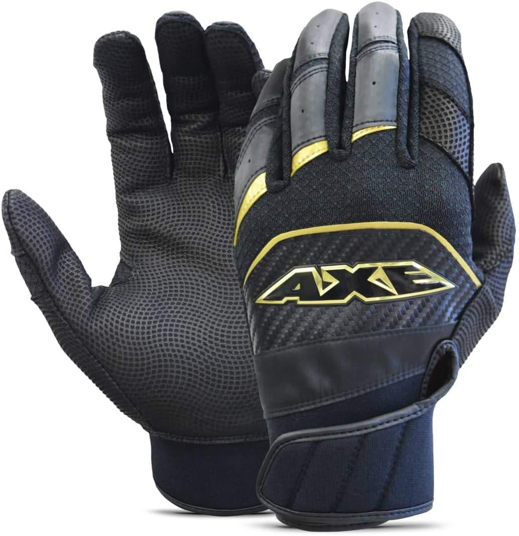 New Axe Pro-Fit Batting Gloves Adult Small Black/Gold Premium Cabretta leather Digitally embossed 1-piece leather palm 4-way stretch knit for superior flex and comfort Leather inserts reinforce high-wear zones Reverse-flap cuff for ultimate fit and mobility