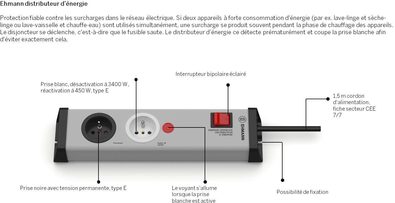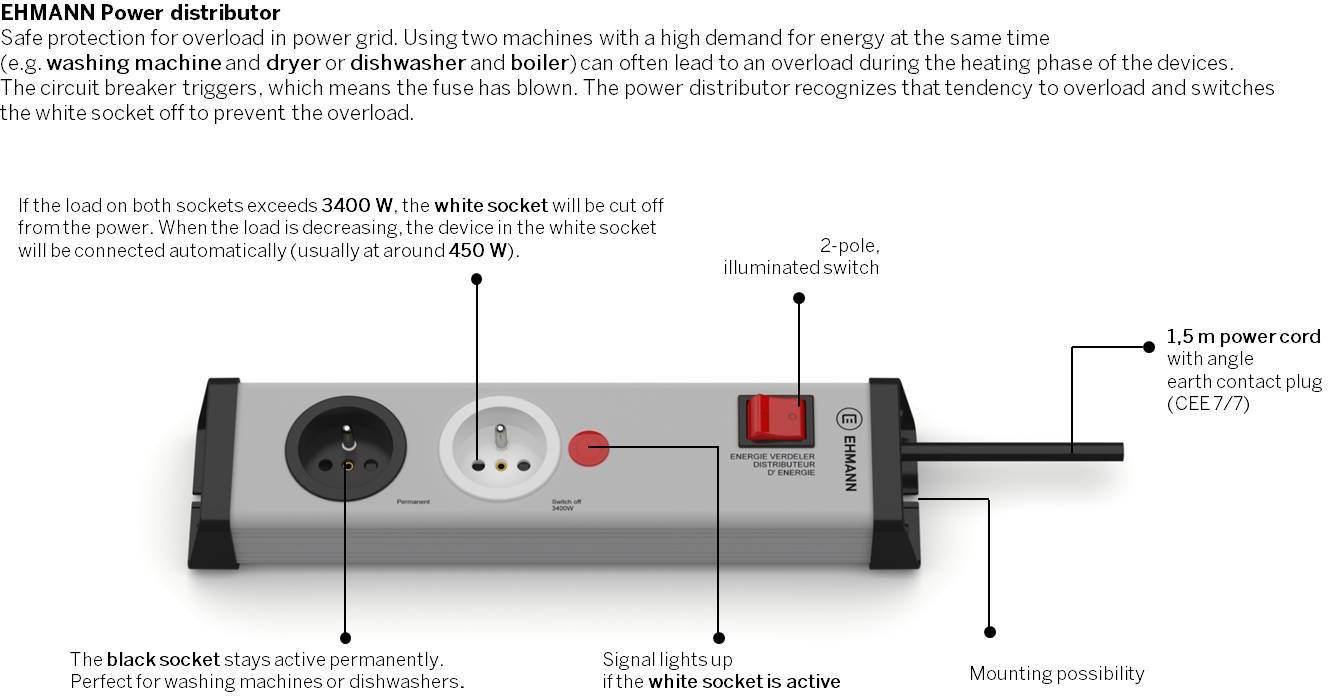 L'installation domestique existante n'est pas toujours conçue pour répondre aux besoins énergétiques de plusieurs appareils électriques. Lors du branchement d'un sèche-linge, d'un lave-linge ou d'une chaudière et d'un lave-vaisselle sur un circuit électrique, il peut y avoir une surcharge lors du chauffage simultané des deux appareils. Le répartiteur d'énergie spécial empêche un consommateur de déclencher le fusible ou de créer un incendie de ligne en cas de coupure de courant dépendant de la puissance (3400W). Dès que la puissance absorbée diminue, le deuxième consommateur est automatiquement réactivé. Ce texte a été traduit par une machine.