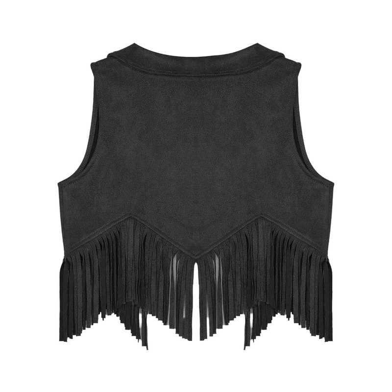 A suede cowgirl vest for girl, has lapel collar, pointed bottom and open front without button.