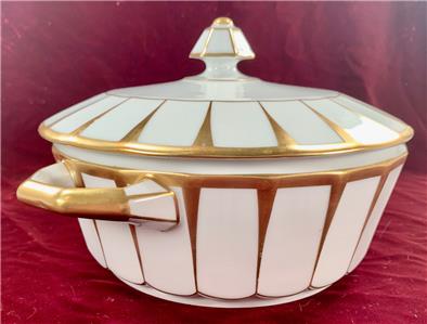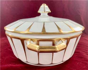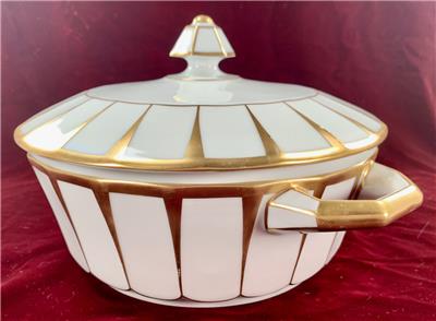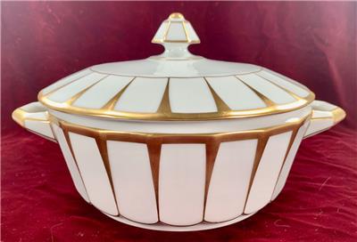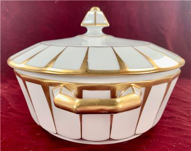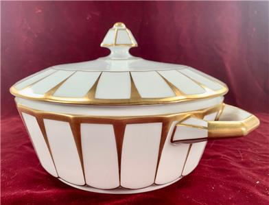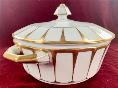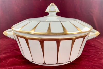 - Furstenberg Grecque Athena Covered Casserole Round Vegetable Serving Bowl With Lid - Made In Bavaria/Germany - Porcelain - 6-Sided Hexagonal Knob On Lid - Two Handles On Bowl