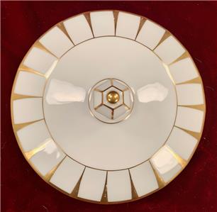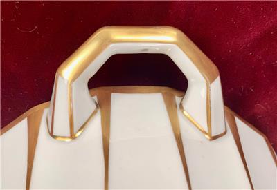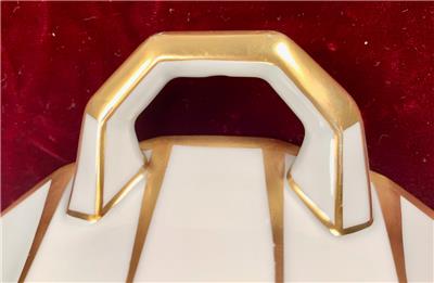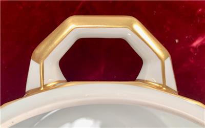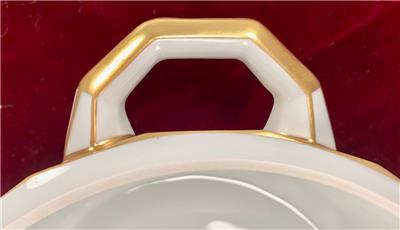 - Some tiny spots of very light color wear to the gold paint, where the color has turned slightly orange/copper - Additionally, a few tiny spots of color/paint loss, mainly around the edges of the lid and on the handles of the bowl