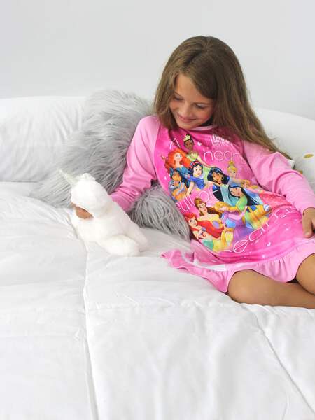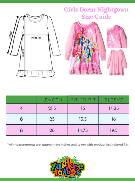 - LONG SLEEVE DORM NIGHTGOWN - Your little girl can feel like a princess in her sleep in this new Disney Princess nightgown! This beautiful long sleeve nightgown is available in big girls sizes 4, 6, and 8.