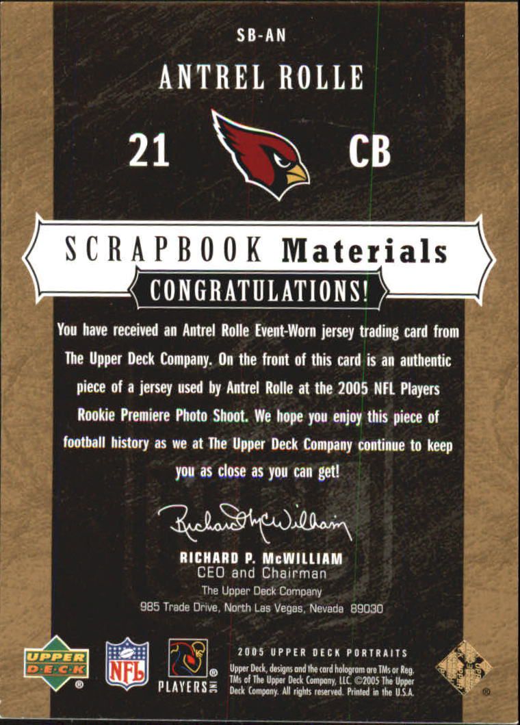 B3837- 2005 UD Portraits Scrapbook-Materialien #SBAN Antrel Rolle Jersey – NM-MT