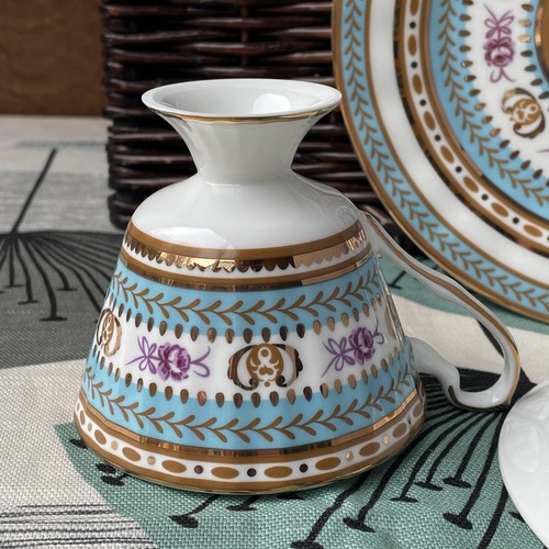 ☕️ The cup has a height to the top of the handle of approximately 8.1cm, with a diameter across the rim of about 8.8cm and across the foot of about 4.5cm. The saucer has a diameter across the rim of about 14.4cm approx