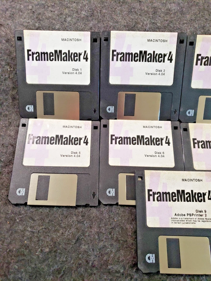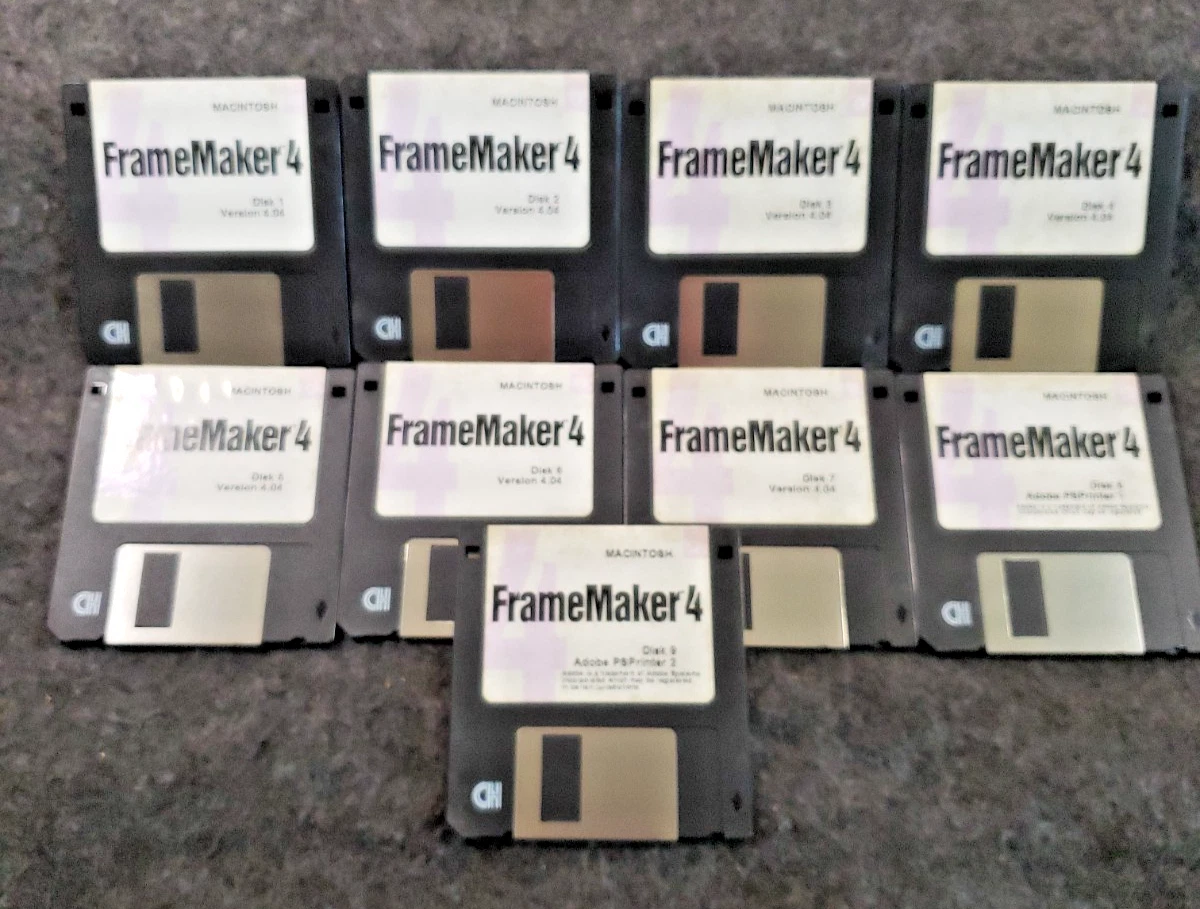 Adobe Framemaker 4 ~ 9 disk set for Macintosh ~ Version 4.02 ~ VTG ~ 3.5"(C19B2)......................... Untested...................... We have no floppy drive to test these disks..................... You will receive only the items shown in the photos..................... As shown....................... As pictured.....................