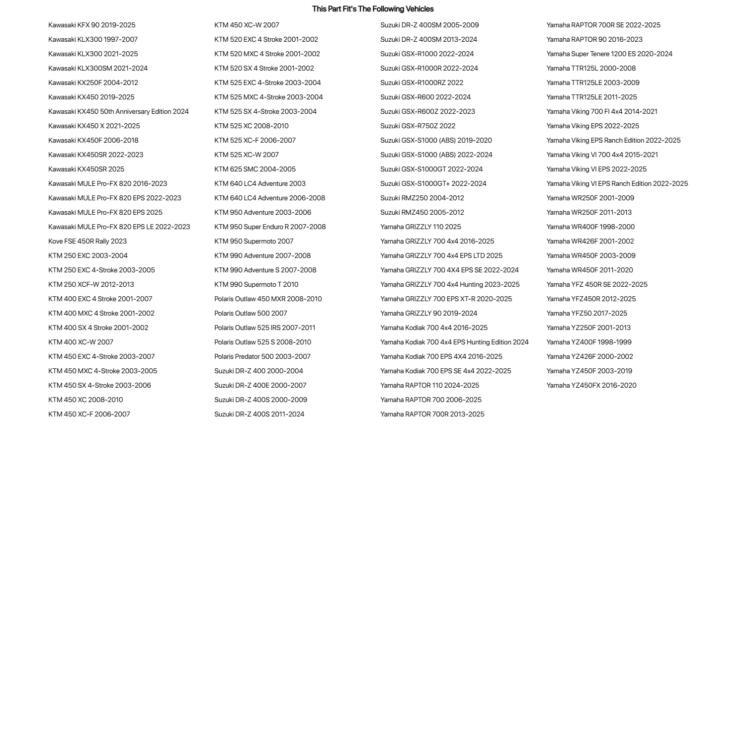 • For use on models like the CRF450/250, TRX450R, YZ/WR250f/400f/426f/450f, YFZ450, DRZ400, KLX300, and more.