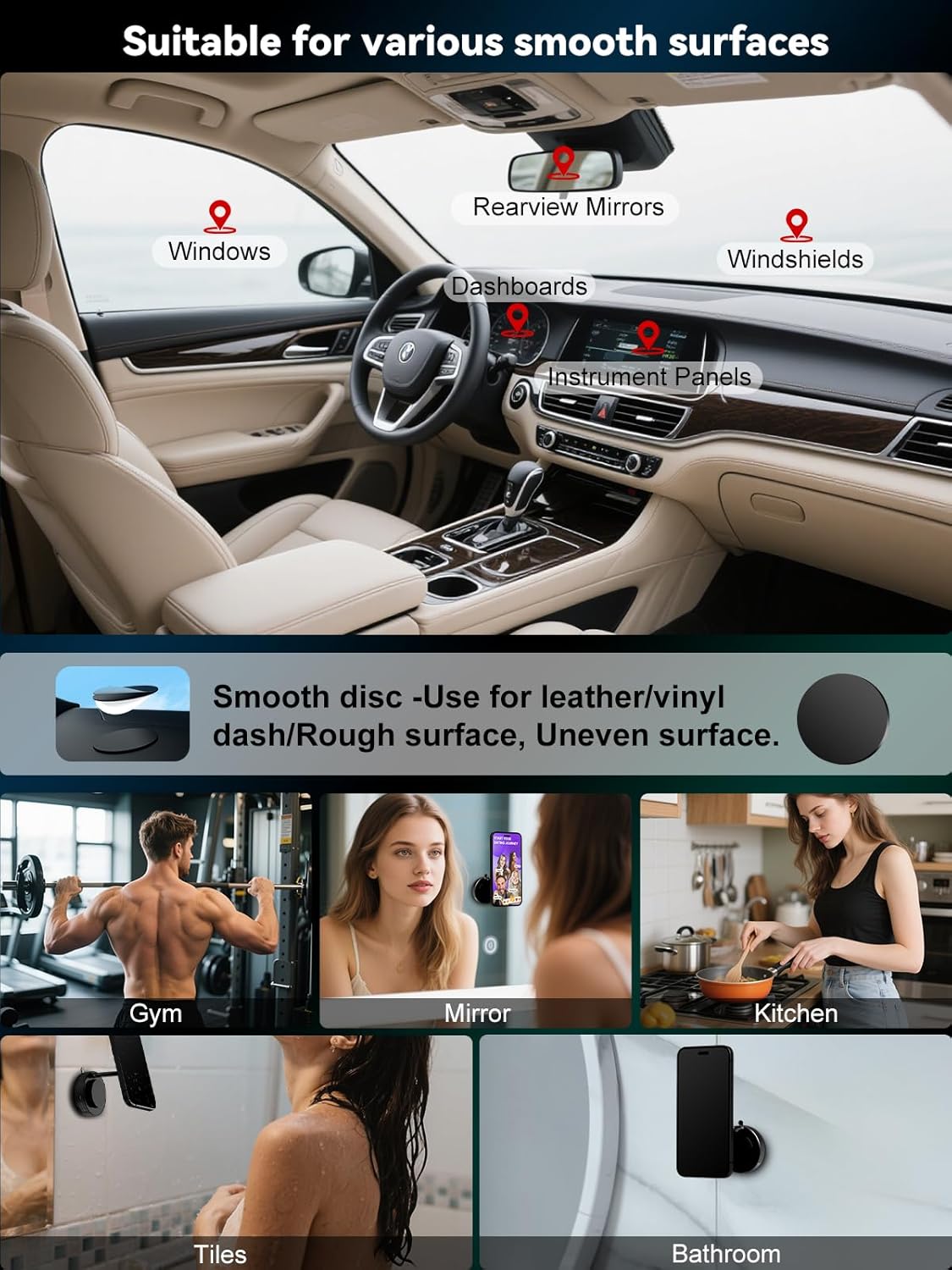 - [No Charging, No Noise] Ditch clunky chargers and noisy motors. Our vacuum magnetic phone mount lets you attach/detach the mount in seconds—clockwise to lock, counterclockwise to release. Perfect for quick car swaps or grabbing your phone mid-drive. Bonus:Including a smooth disc that allows the vacuum phone holder to securely grip the textured area.