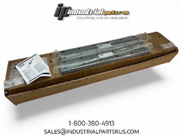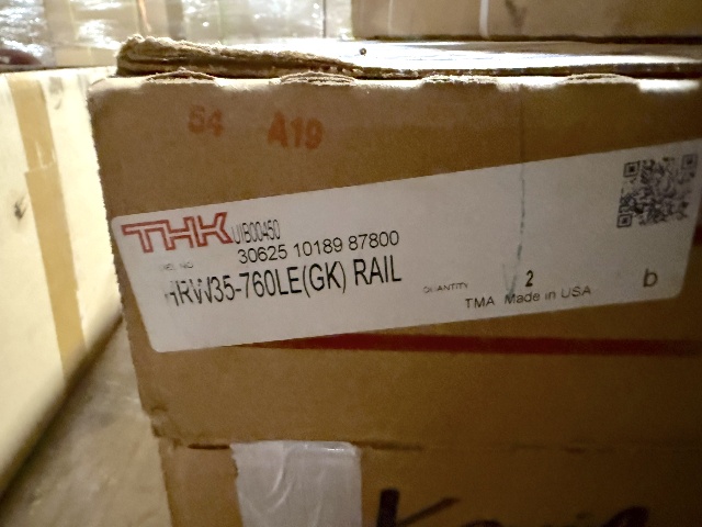 THK HRW35-760LE GK Linear Guide Rail, 35 mm wide, 760 mm length, NEW in package (2 rails). High load capacity 27.2 kN; hardness 58-64 HRC. Precision linear rail for CNC machines, automation, robotics. Lightweight 15.43 lb total. Trustworthy THK quality, ready to install.