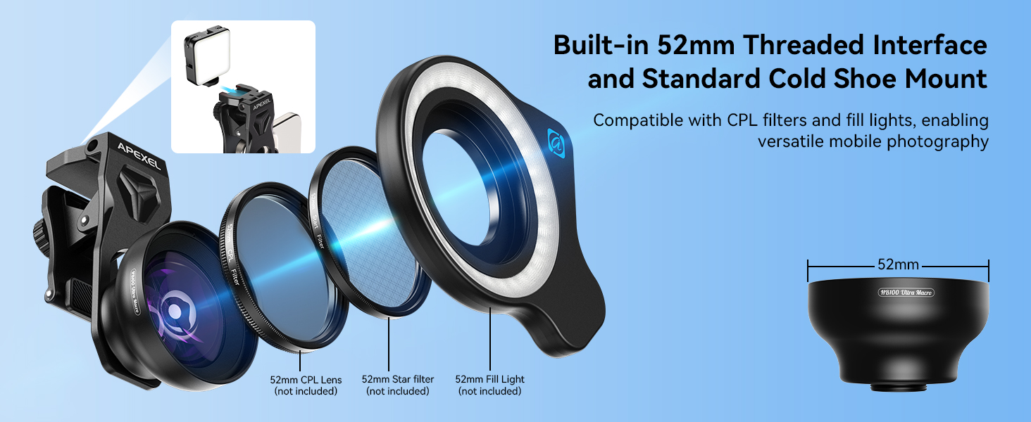 【APEXEL Macro Lens, Endless Possibility】Craving more creative photos or videos? The HB100Ultra features a built-in filter thread interface. Pair it with 52mm starlight or CPL filters(not including) to unlock DSLR-level filter effects in mobile macro photography—no professional gear required.Built-in cold shoe mount for attaching fill lights, ensuring outstanding performance even in low-light conditions