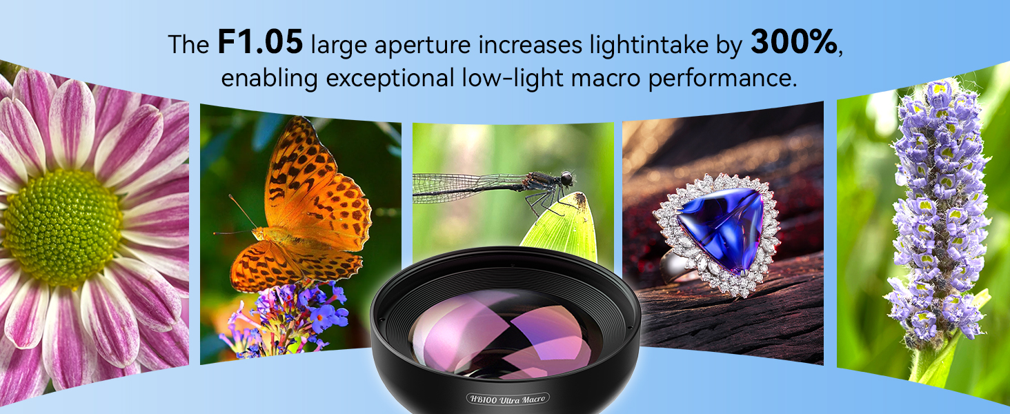 【Stunning Bokeh and Depth of Field】To achieve real-to-life image quality, HB100ultra macro lens is equipped with an ultra-large F1.05 aperture. This feature provides every photo with beautiful bokeh and depth of field, resulting in professional-quality images of flowers and insects. Additionally, the large aperture helps photographers manage low-light conditions effectively.