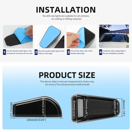 2. LED Chip: The Solar-Powered Cab Lights is Equipped with 12 super light LEDs, deliver optimal nighttime visibility across worksites or highways. The 5-light set ensures 360° coverage while maintaining energy efficiency through solar charging.