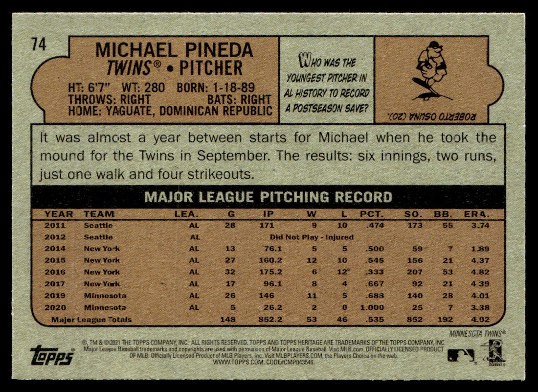 2021 Topps Heritage Michael Pineda Minnesota Twins #74
