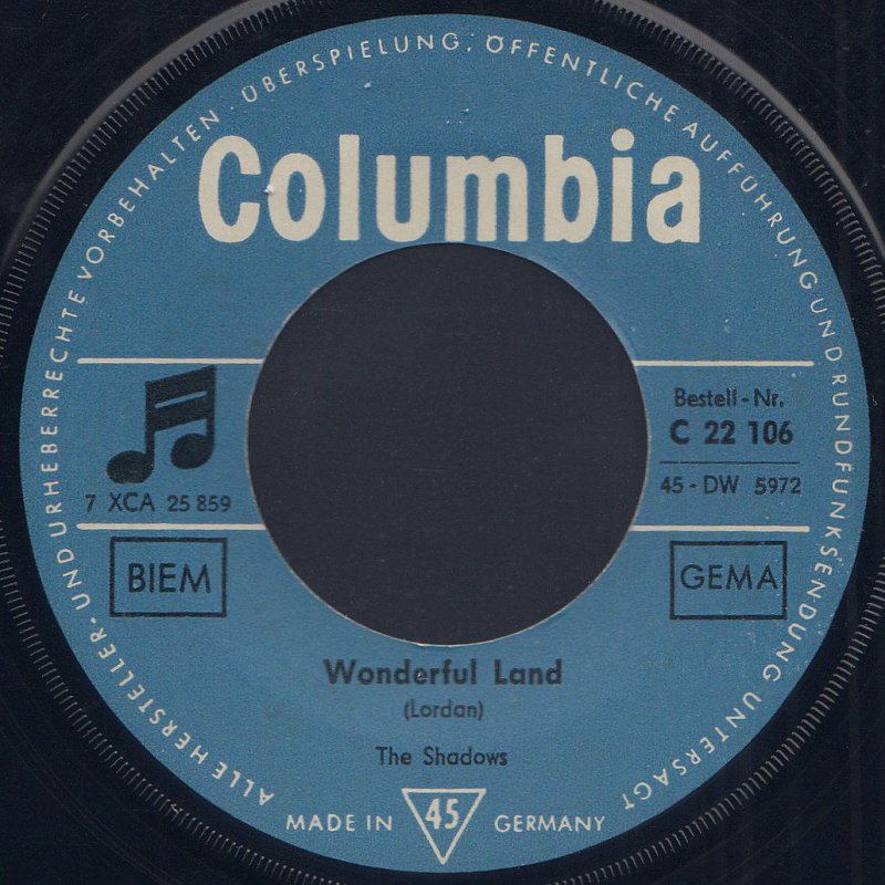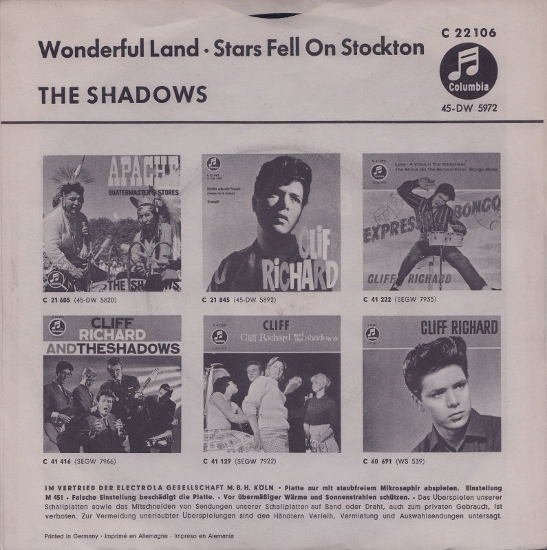 THE SHADOWS: Wonderful Land / Stars Fell On Stockton (´61 / scarce orig. German issue / COLUMBIA C 22 106 / blue label)