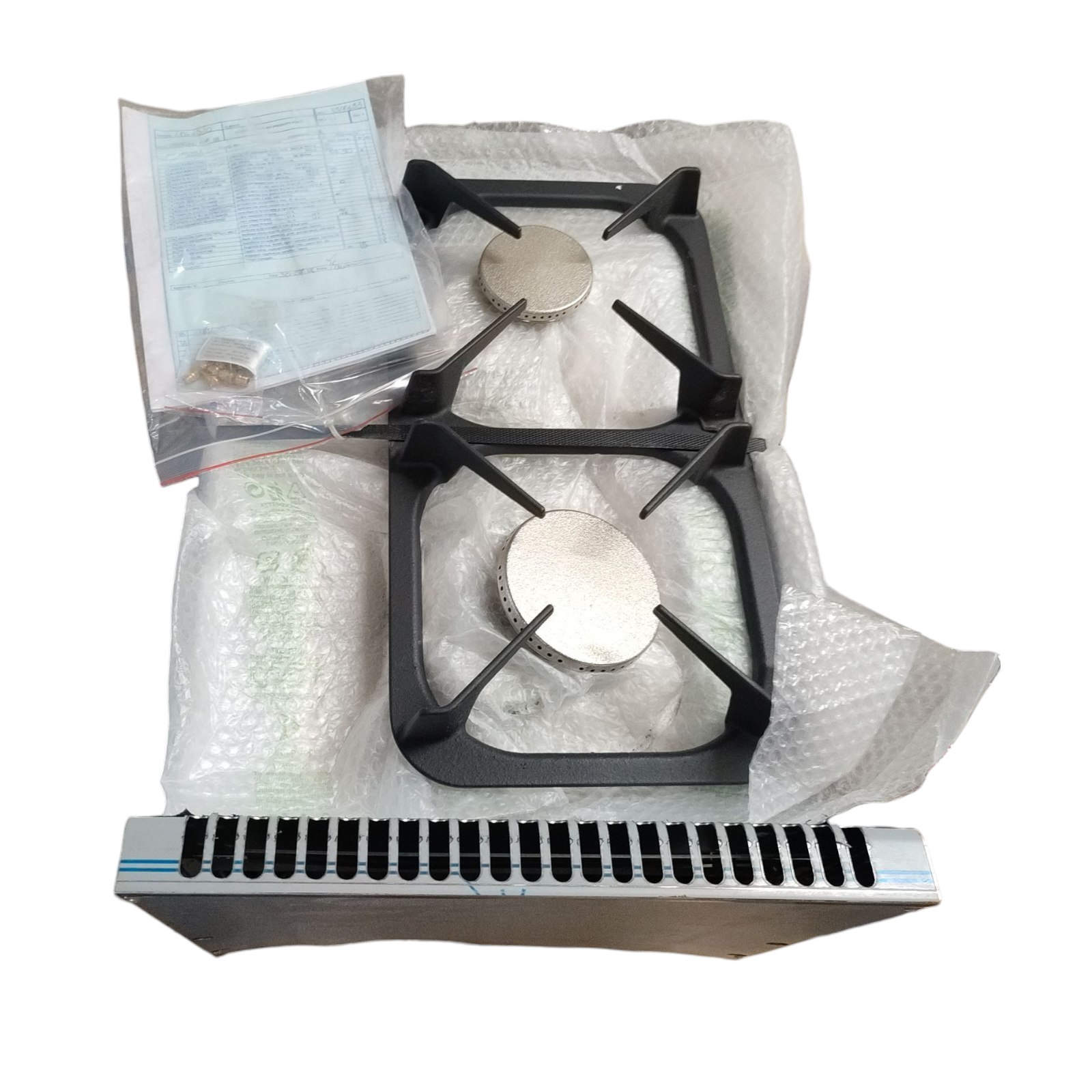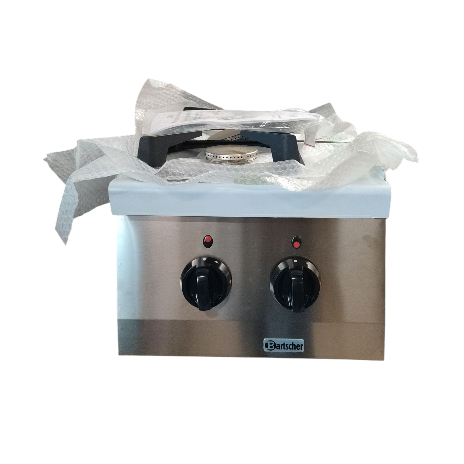 Cns 18/10.Abmessungen: B 400 x T 600 x H 290 mm.Leistung: 9,5 kW.1 Brenner 3,5 kW (vorne).1 Brenner 6,0 kW (hinten).Gas.