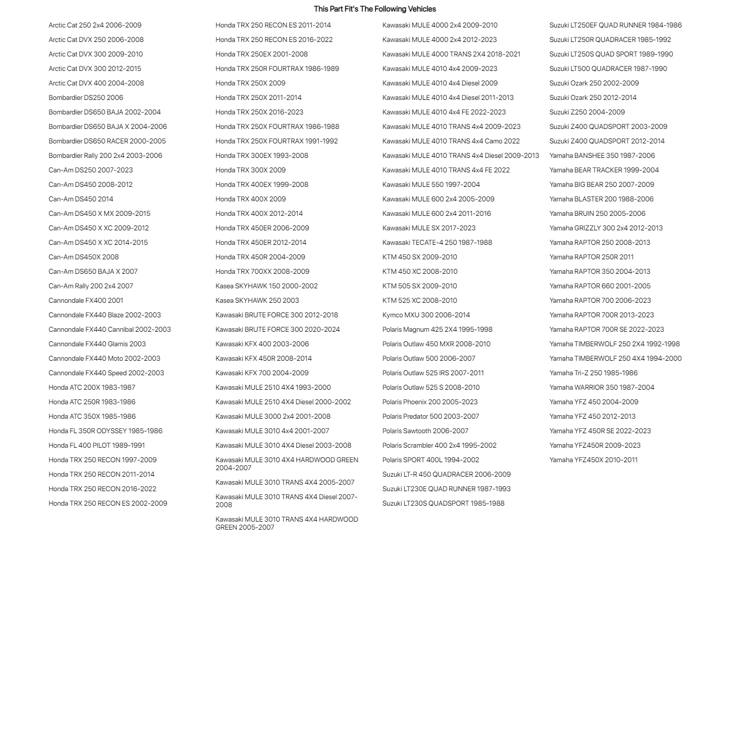 Oversize tires may rub under extreme steering angles, and extreme suspension compression. SAFETY:Refer to your machine’s documentation for proper maintenance. Always give tires a gentle “run-in” period of 100 miles to get the feel of new tires. Always match the front and rear tires for optimal handling, safety and performance. Mixing radials with bias may adversely affect handling and stability. Worn/unworn tire combinations and worn tires used in wet conditions can result in deteriorated handling. WARNING:The charts and info on this page do not imply interchangeability. Consult your machine’s manual to determine correct replacements, clearances, compatibility and stability, load-bearing capacity, speed rating, radial vs. non-radial, pattern and tread compound requirements, inflation recommendations and front-to-rear tire matching. Wrong selection can result in tire failure or loss of control with serious injury or death.