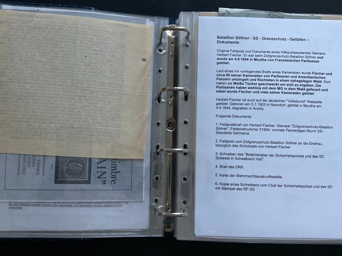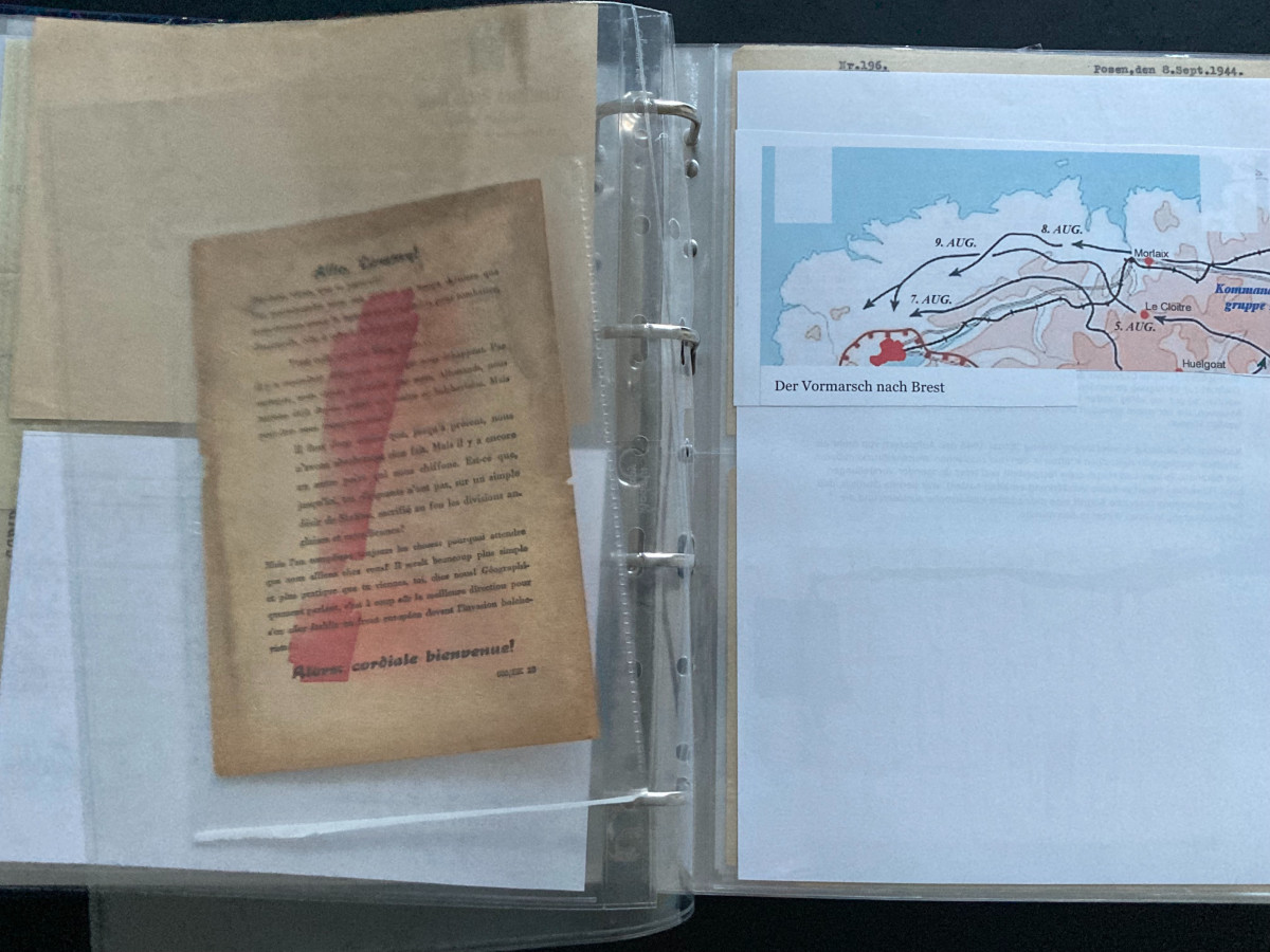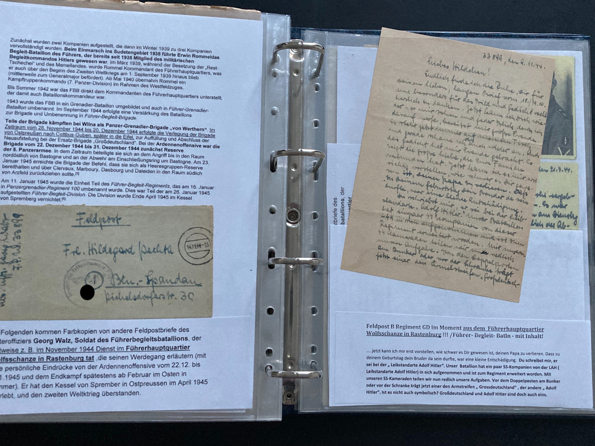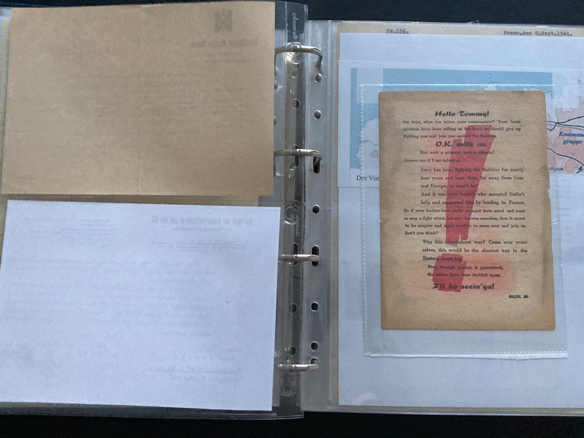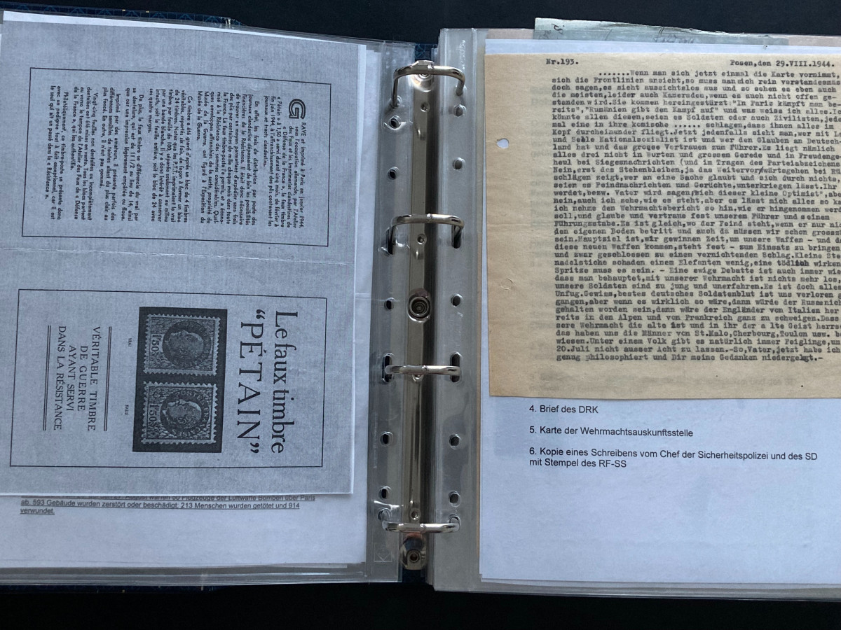 Des Weiteren finden sich darin Flugblätter, einzelne Briefinhalte oder Berichte (teilweise als Fotokopien) aus den Bereichen SS, Waffen-SS, Marine, Luftwaffe und Heer.