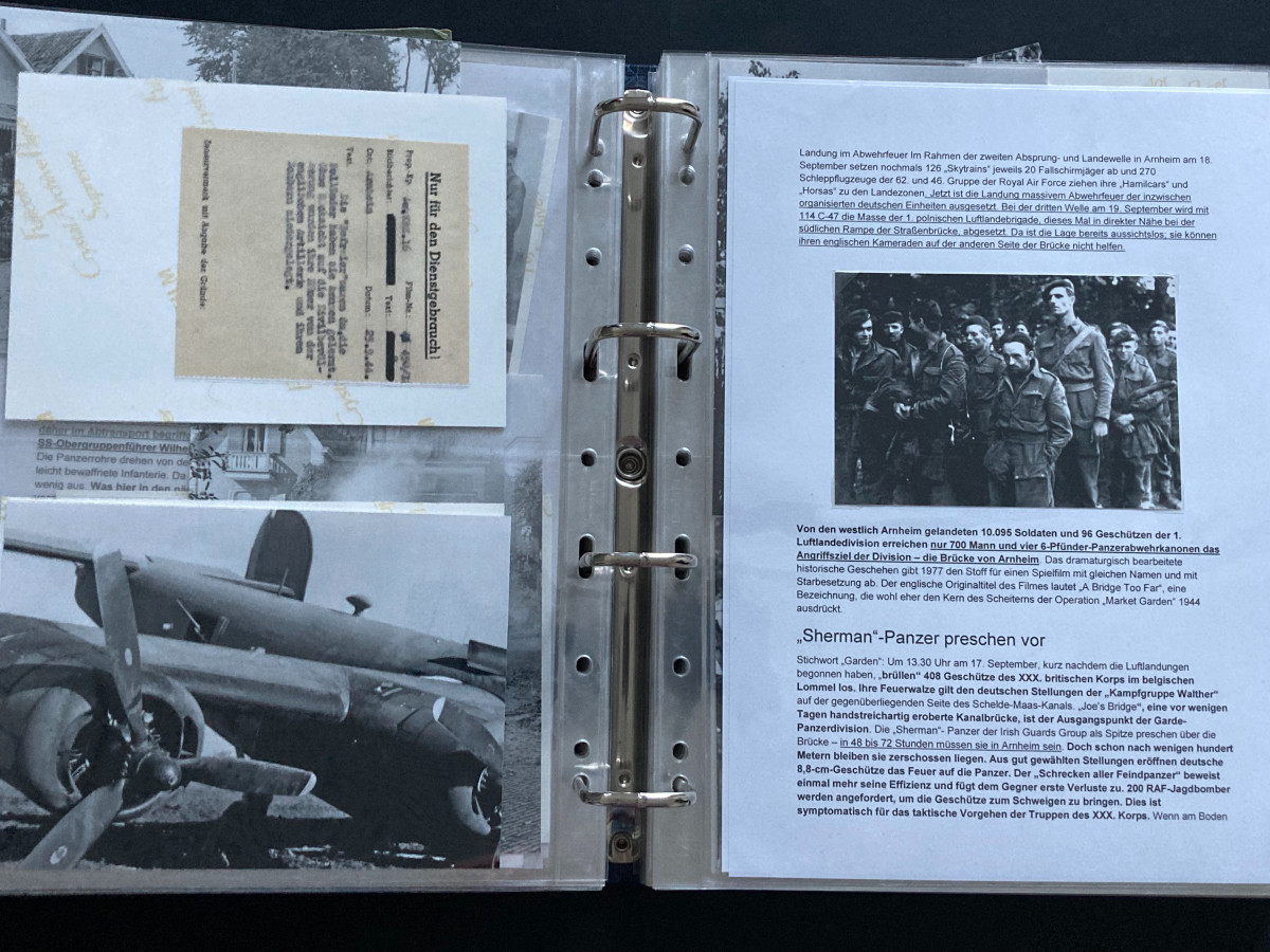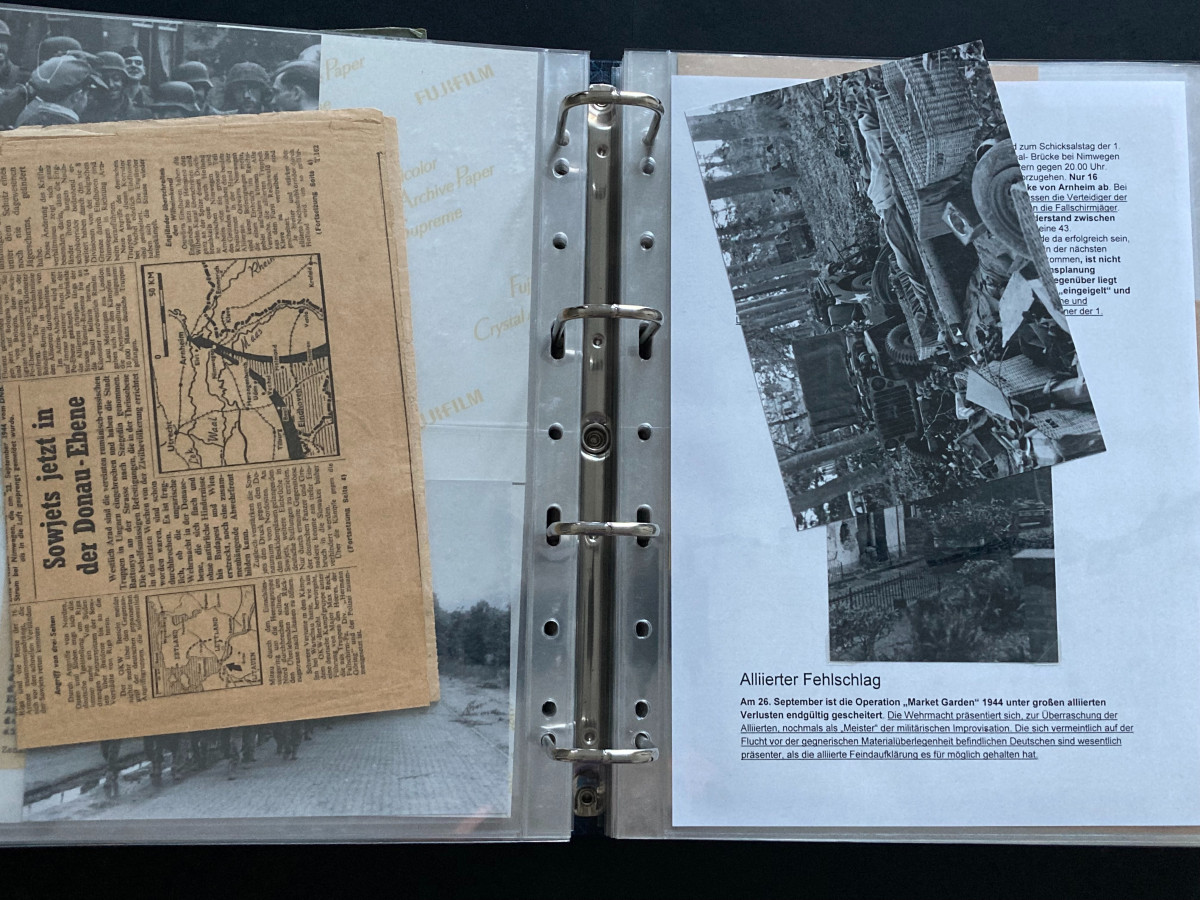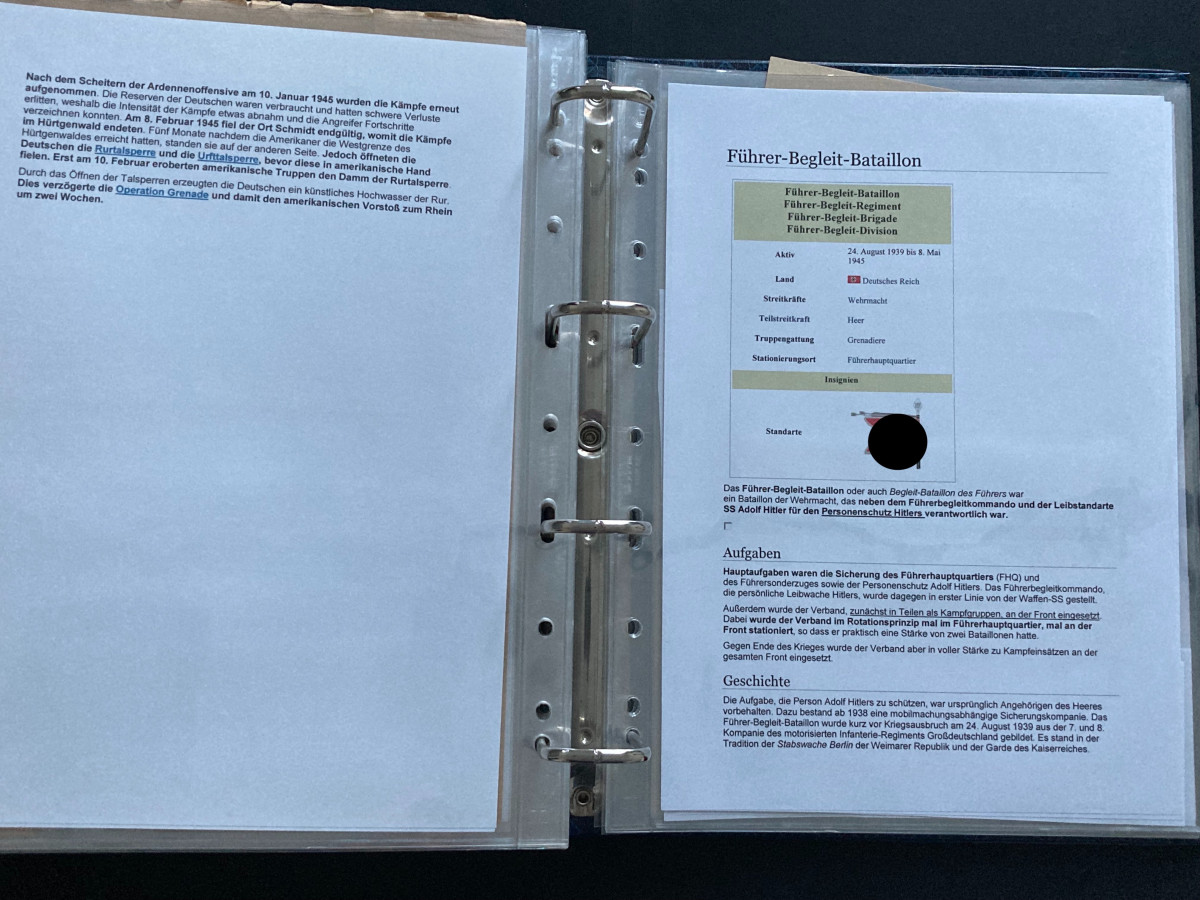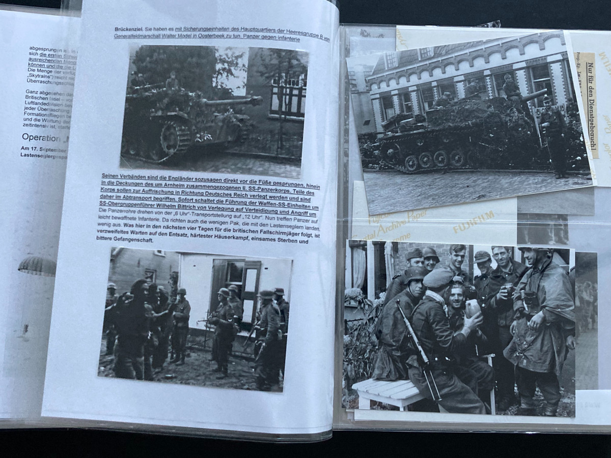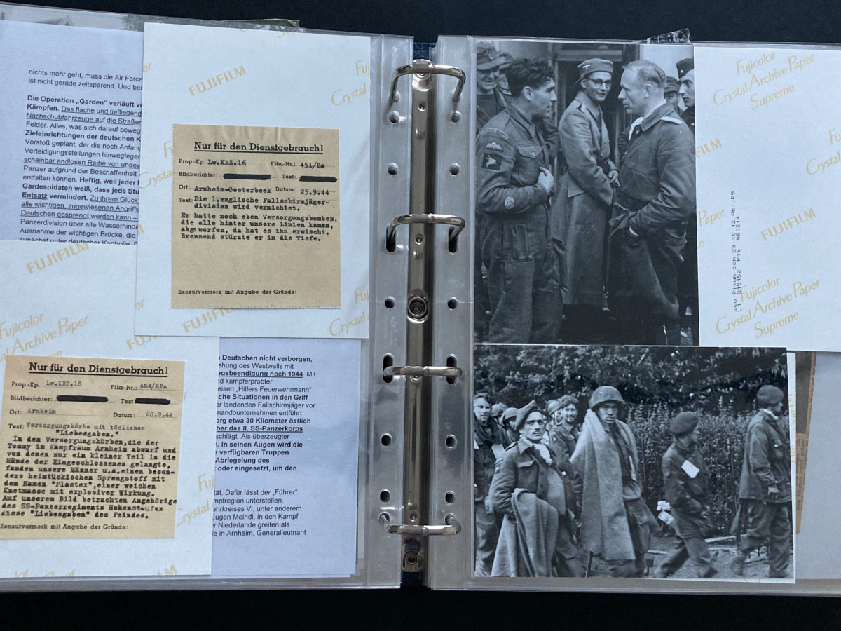 Des Weiteren finden sich darin Flugblätter, einzelne Briefinhalte oder Berichte (teilweise als Fotokopien) aus den Bereichen SS, Waffen-SS, Marine, Luftwaffe und Heer.