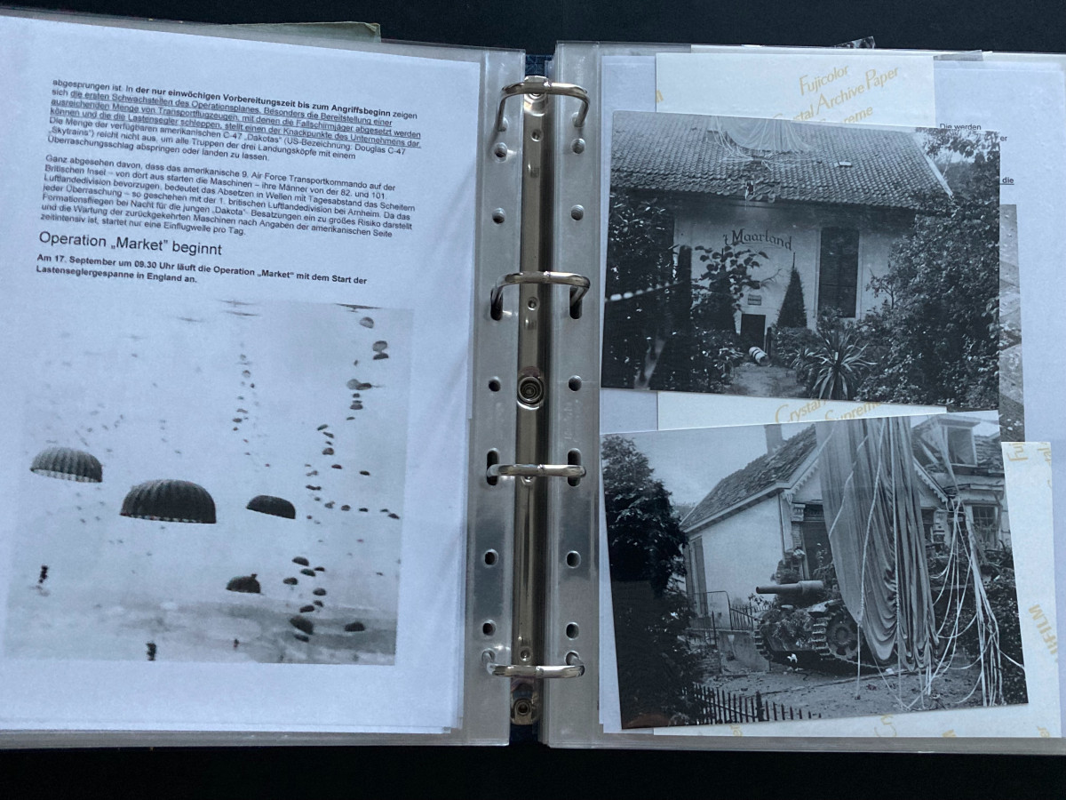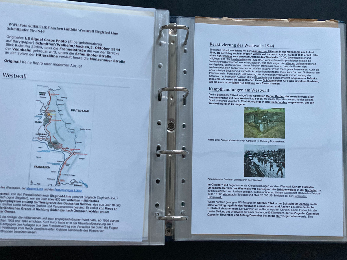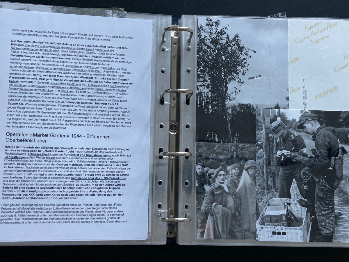 Verteilt auf insgesamt 14 Ordner enthält sie (Inhalt jeweils unterschiedlich) Feldpostbriefe, Feldpostkarten, Kriegsberichte, Fotos (überwiegend Abzüge von originalen Aufnahmen) sowie ausführliche Erklärungen zu den verschiedensten durchgeführten Operationen.