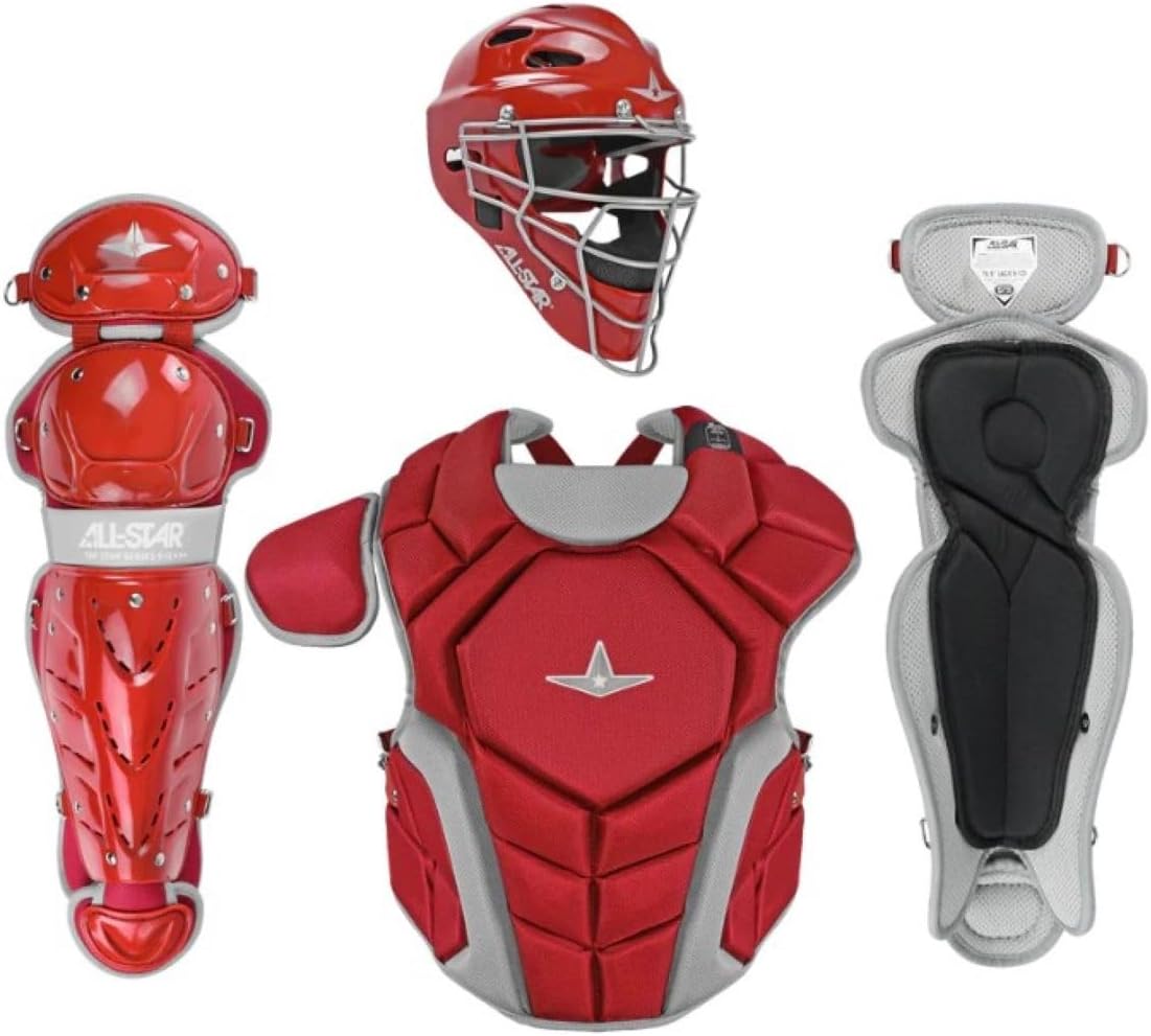 New All-Star Top Star Series Baseball Catching Equipment Kit Ages 7-9 Red029343066962 NOCSAE TOP STAR SERIES BASEBALL EQUIPMENT KIT: All-Star Top Star Series - Essential baseball catcher's gear includes helmet, chest protector, leg guards, and a throat guard. All are durable and protective gear to ensure safety while on the field. CHEST PROTECTOR: The chest protector features internal PE Protective plates for added safety as well as a 4-point adjustable harness to dial in the right fit. This also helps you to stay safe and comfortable while playing. LEG GUARDS: The double protective knee design keeps these light weight and mobile with less bulk. The traditional straps allow for fast adjustment and easy on/off. PROTECTION & COMFORT: Stay comfortable and safe behind the plate with All-Star's Top Star Series catcher's gear. The Top Star series was built for the seasoned travel ball catcher.