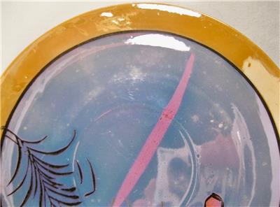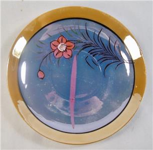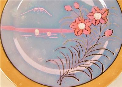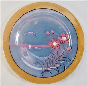 - This pattern features handpainted pink and white flowers with green and black stems - There is a pink volcano in the background of the design - Main portion of the plate is a light blue luster - Peach luster edge