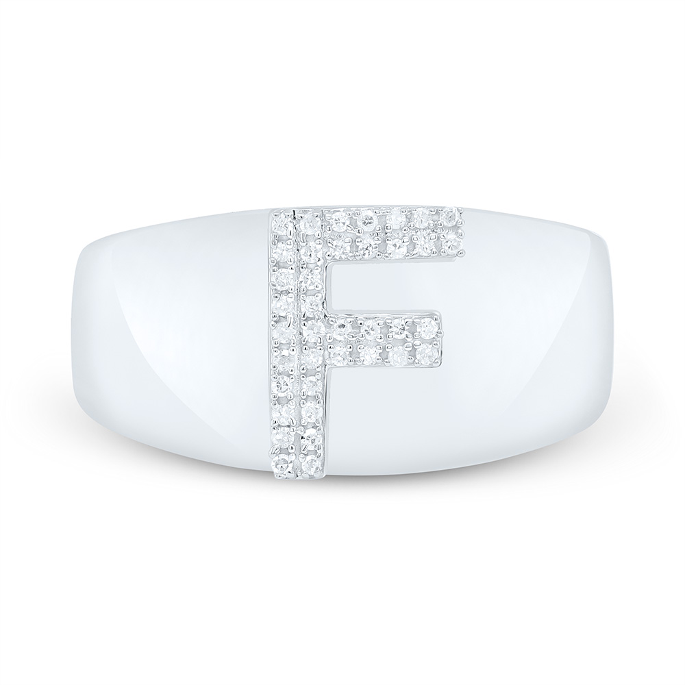 This exquisite Diamond Block Front | Initial F, casted in 925 Sterling Silver. Radiant with 0.11 ct. t.w. of Round cut diamonds and high polished to a bright lustrous shine. This ring will sparkle for a lifetime, a look she'll always treasure. Diamonds are Prong set in-between the Sterling Silver mounting to securely fasten the diamonds. The Diamonds are hand set precisely to give it a smooth uniform flow. Solid mounting, the ring weighs approx. 4.45 gr. All diamonds in this ring are matching in clarity and color. Currently this ring is ladies size 10, if you would like this ring in a different size please message us, for resizing charges and we will get back to you right away. This ring can be sized at your local jeweler as well.
